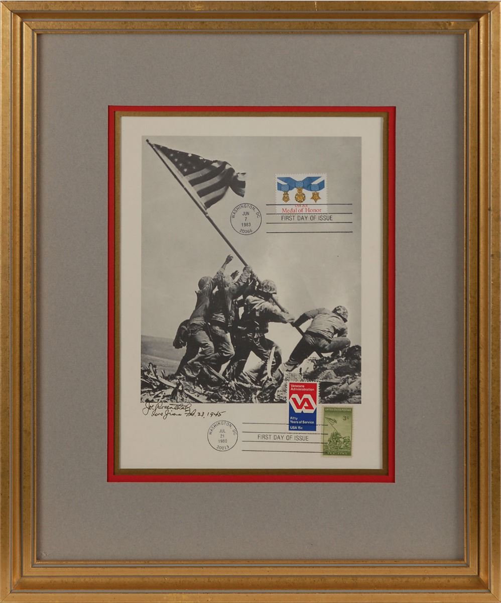Cardstock 8 x 10.5 photo of the Iwo Jima flag raising as taken by Rosenthal, signed in the lower border in black felt tip, “Joe Rosenthal, Iwo Jima Feb. 23, 1945.” Photo bears affixed commemorative postage stamps with first day cancellations. Triple-matted and framed to an overall size of 15 x 17.75. In fine condition. Pre-certified PSA/DNA.