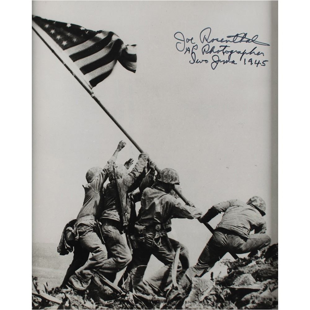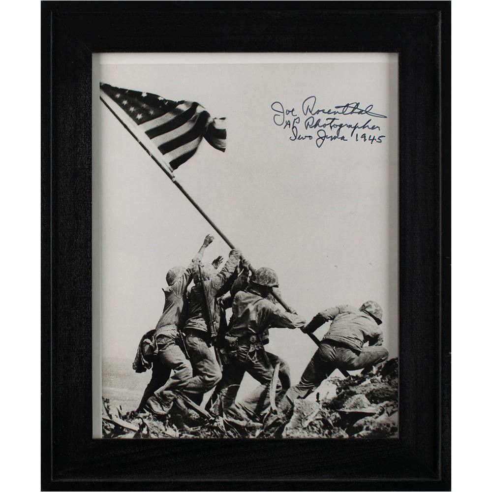 Iconic glossy 7.75 x 9.75 photo of the Mount Suribachi flag-raising after the Battle of Iwo Jima, signed in black felt tip, "Joe Rosenthal, AP Photographer, Iwo Jima 1945." Framed to an overall size of 10.25 x 12.2.5. In fine condition, with scattered light creasing.