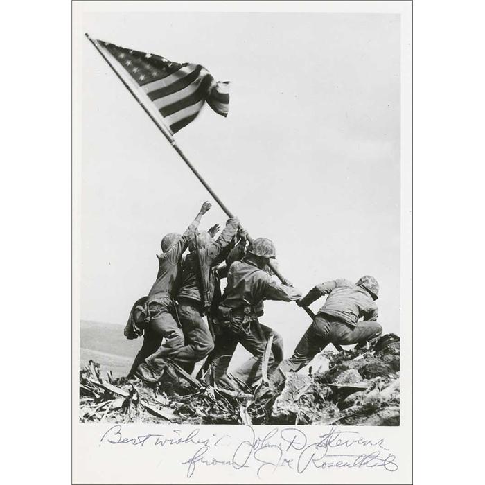 Glossy 5 x 7 photo of the Iwo Jima flag raising, signed and inscribed in black ballpoint “Best wishes to John D. Stevens from Joe Rosenthal.” In fine condition, with a few light creases and some mild skipping to signature and inscription. RRAuction COA.