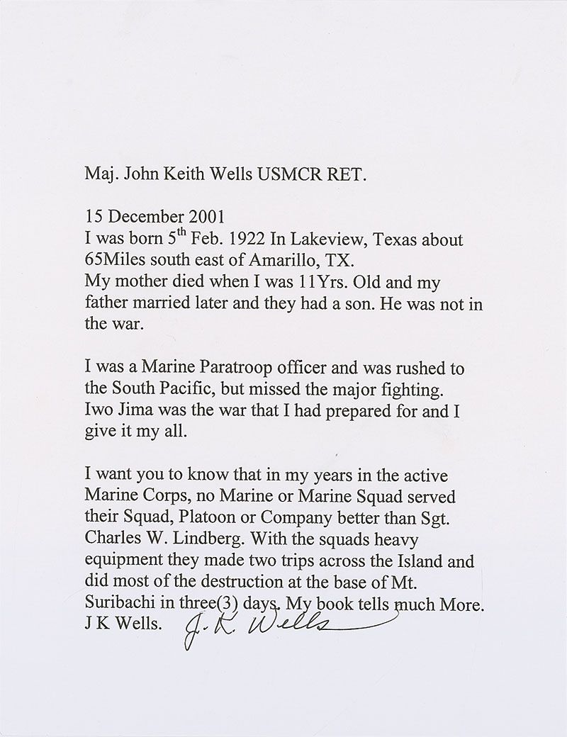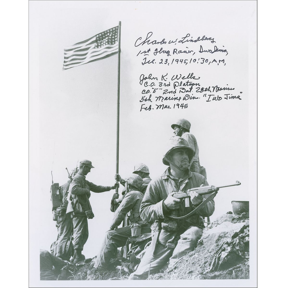 Two items: satin-finish 8 x 10 photo of the first flag raising on Mount Suribachi, signed in black felt tip, “Charles W. Lindberg, 1st Flag Raiser, Iwo Jima, Feb. 23, 1945, 10:30, A. M.” and “John K. Wells, C. O. 3rd Platoon, CO ‘E’ 2nd Bat. 28th Marines, 5th Marine Div. ‘Iwo Jima’ Feb. Mar. 1945” ; and a one-page typed testimonial, signed by Wells, dated December 15, 2001, detailing his and Lindberg’s involvement at Iwo Jima. In fine condition.