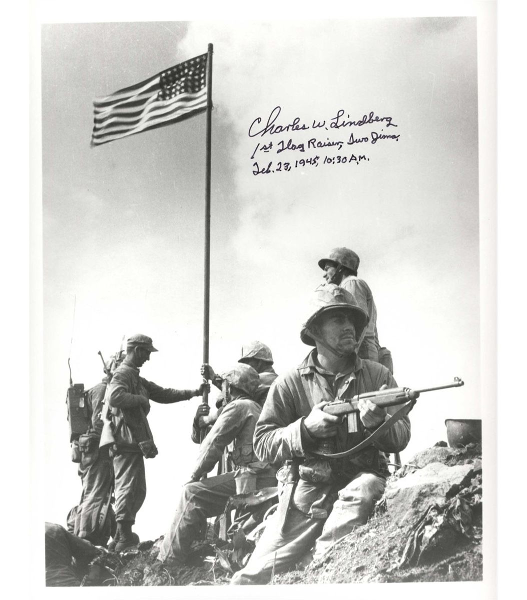 Iwo Jima flag raising photo signed by Charles W. Lindberg, the oldest surviving member of the U.S. military team who raised the flag on Iwo Jima. Lindberg, who died in 2007 at the age of 86, signs boldly: ''Charles W. Lindberg / 1st Flag Raising, Iwo Jima / Feb. 23, 1945 10:30 am''. Excellent, clear photo measures 8'' x 10'' with a .5'' border. Fine.