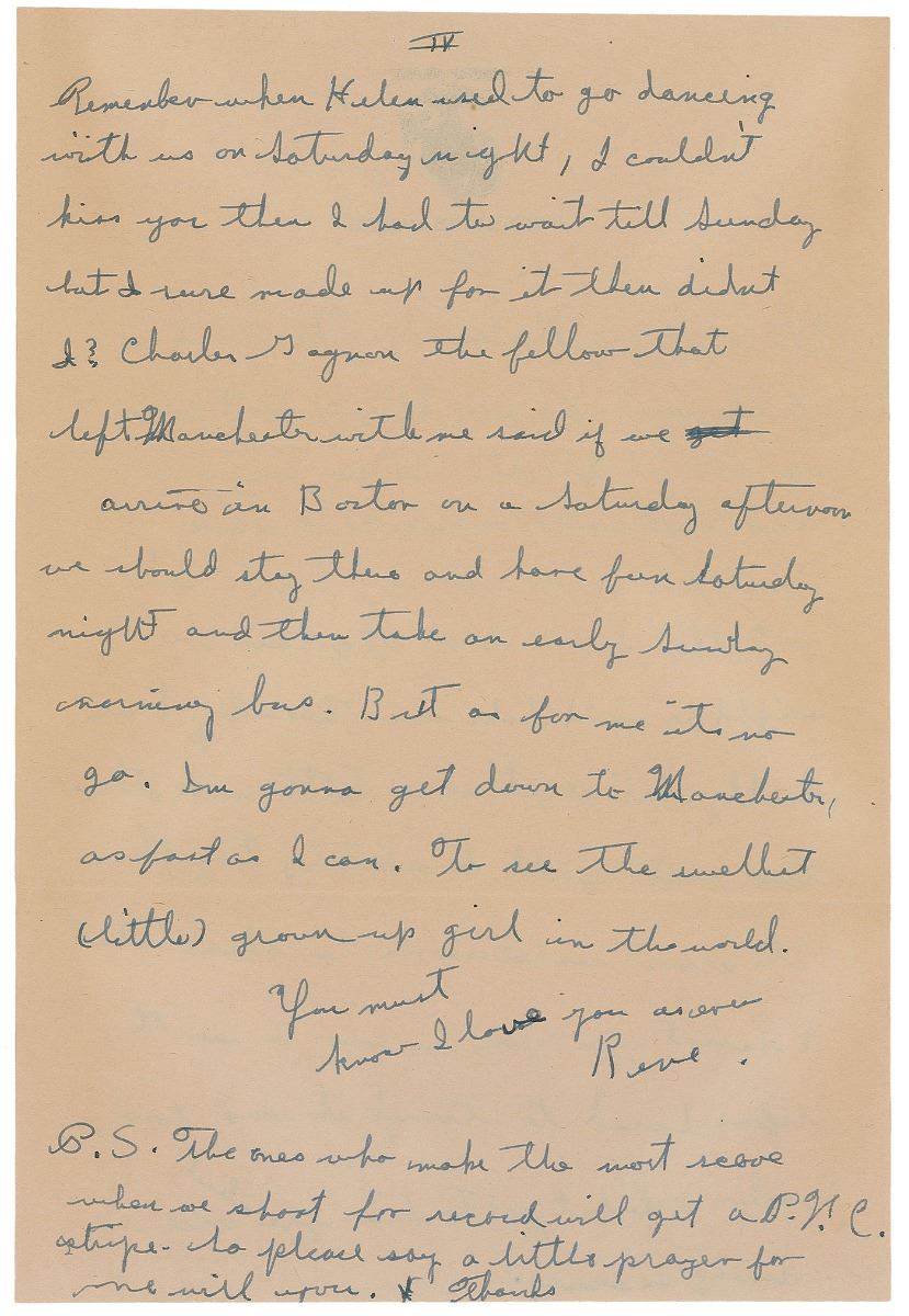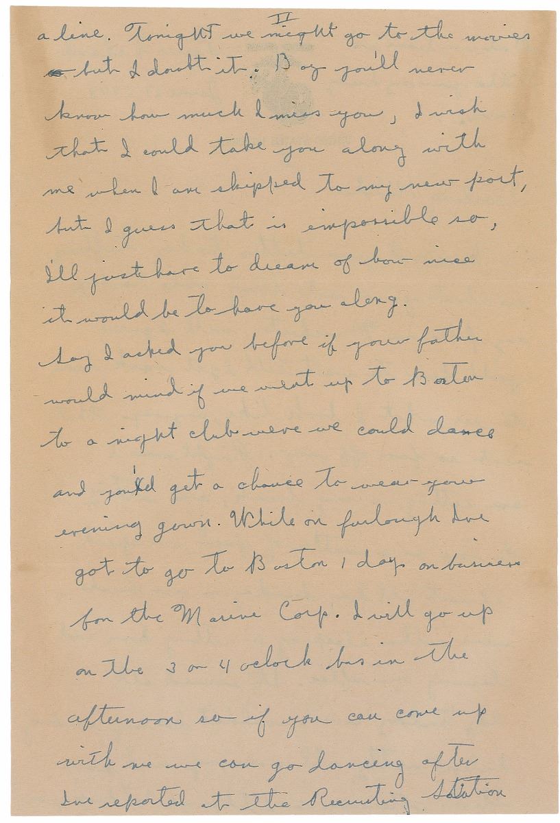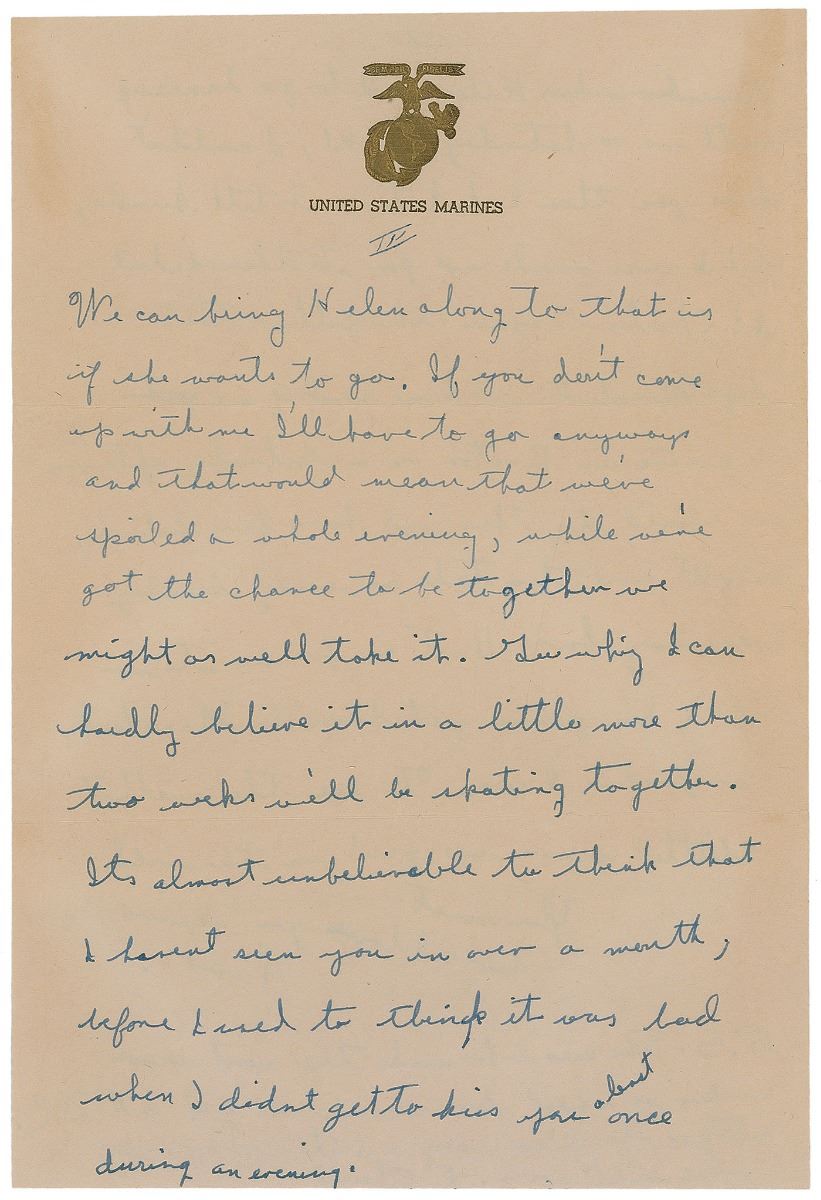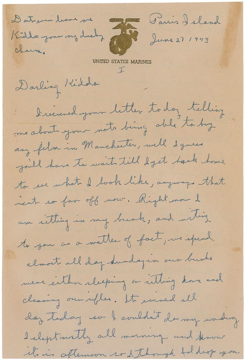 United States Marine (1925–1979) who was immortalized in Joe Rosenthal's famous World War II photograph as one of the six flag-raisers atop Mount Suribachi during the Battle of Iwo Jima. War-dated ALS signed “Rene,” two pages both sides, 7 x 10.25, United States Marines letterhead, June 27, 1943. Letter to his future wife, Pauline Harnois, written from the Marine Corps Recruit Depot at Parris Island, South Carolina, in part: “Right now I am sitting in my bunk, and writing to you as a matter of fact, we spend almost all day Sunday in our bunks we're either sleeping or sitting down and cleaning our rifles…Tonight we might go to the movies—but I doubt it. Boy you'll never know how much I miss you, I wish that I could take you along with me when I am shipped to my new post, but I guess that is impossible so, I'll just have to dream of how nice it would be to have you along…While on furlough I've got to go to Boston 1 day on business for the Marine Corp. I will go up on the 3 or 4 oclock bus in the afternoon so if you can come up with me we can go dancing after I’ve reported at the Recruiting Station. We can bring Helen [her sister] along too that is if she wants to go. If you don’t come up with me I’ll have to go anyways and that would mean that we’ve spoiled a whole evening, while we’ve got the chance to be together we might as well take it. Gee whiz I can hardly believe it in a little more than two weeks we’ll be skating together. Its almost unbelievable to think that I havent seen you in over a month, before I used to think it was bad when I didn’t get to kiss you a[t] least once during an evening…P.S. The ones who make the most score when we shoot for record will get a P.V.C. stripe—So please say a little prayer for me will you.” Areas of toning to the top and edges, otherwise fine condition.
