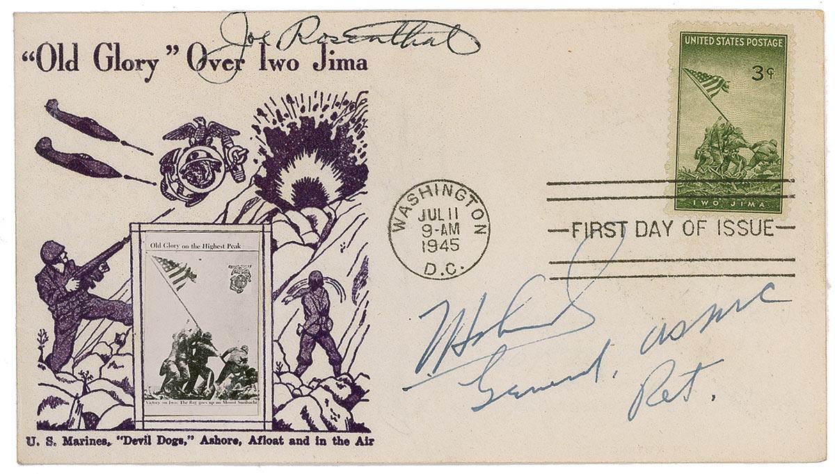 FDC with a cachet honoring “Old Glory” over Iwo Jima, signed in black ballpoint by photographer Joe Rosenthal and blue fountain pen by Marine Corps General Thomas Holcomb, who has added, “General, USMC Ret.” beneath his signature. In fine condition, with scattered toning and surface wear. RRAuction COA.