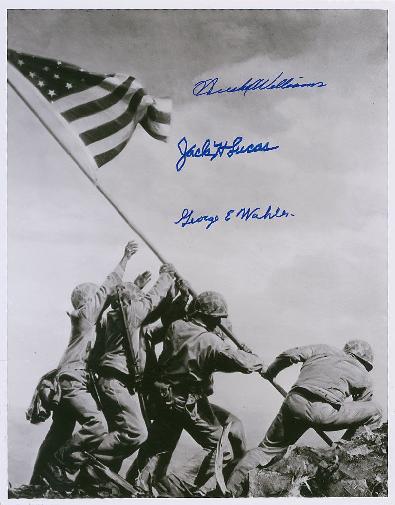 Glossy 14 x 11 photo of the Iwo Jima flag raising, signed in blue felt tip by three Medal of Honor recipients from that battle: Jack Lucas, Hershel Williams, and George Wahlen. In fine condition.