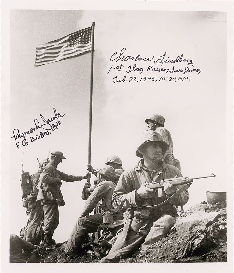 Satin-finish 8 x 10 photo of the first flag raising on Mount Suribachi, signed in black felt tip, “Charles W. Lindberg, 1st Flag Raiser, Iwo Jima, Feb. 23, 1945, 10:30, A. M.” and “Raymond Jacobs, F. Co. 2nd Btn, 28th.” In very fine condition.