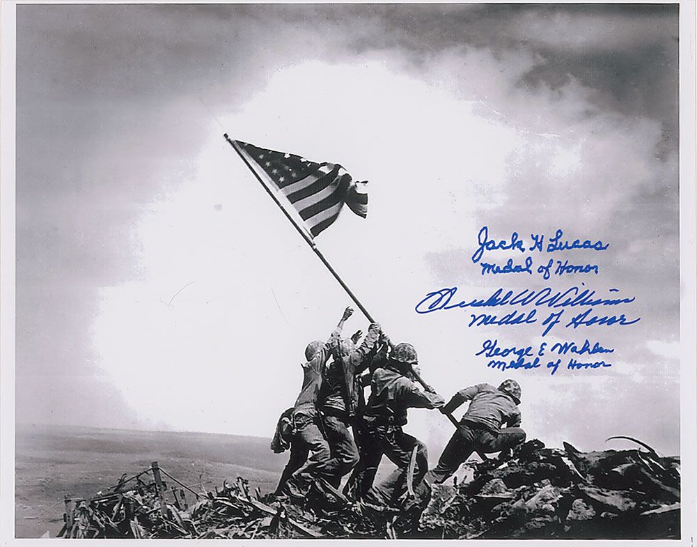 Glossy 14 x 11 photo of the Iwo Jima flag raising, signed in blue felt tip by three Medal of Honor recipients from that battle: Jack Lucas, Hershel Williams, and George Wahlen. In fine condition.