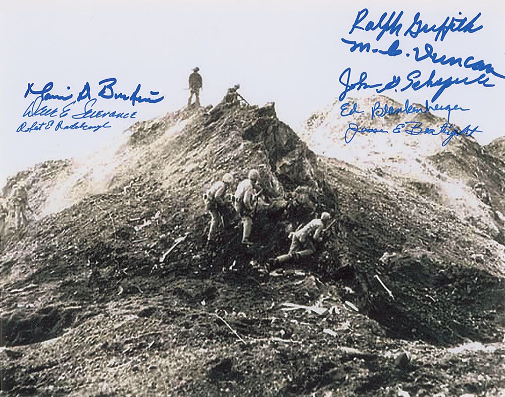 Satin-finish 10 x 8 photo of battle, signed in blue felt tip by Dave Severance, Ralph ‘Pee Wee’ Griffiths, John Scheperle, Marv Burdine, Edward Blankenberger, Jesse Boatright, Robert Radebaugh, and Melvin Duncan. In very fine condition.