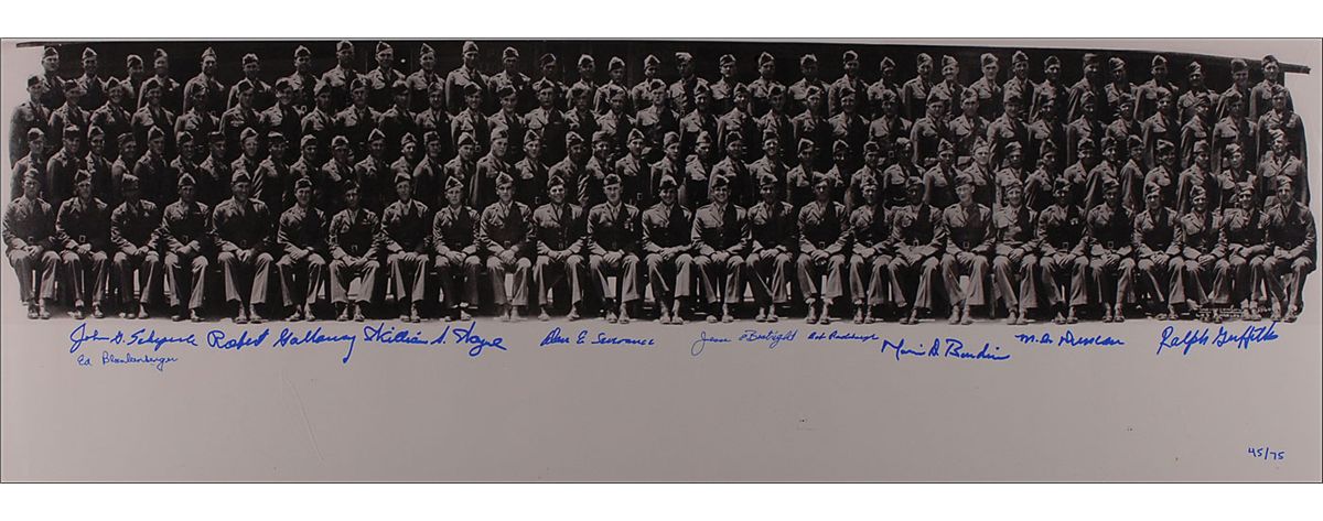 Exquisite limited edition satin-finish 36 x 12 photo of Easy Company, numbered 45/75, signed in blue felt tip by Dave Severance, Ralph ‘Pee Wee’ Griffiths, John Scheperle, Robert Galloway, William Wayne, Edward Blankenberger, Marvin Burdine, Jesse Boatright, Robert Radebaugh, and Melvin Duncan. In very fine condition. This was the flag raising unit—all of the veterans who signed this print served with all six of the flag raisers from boot champ until the Battle of Iwo Jima. Colonel Dave Severance was the Commanding Officer of all six of the flag raisers.