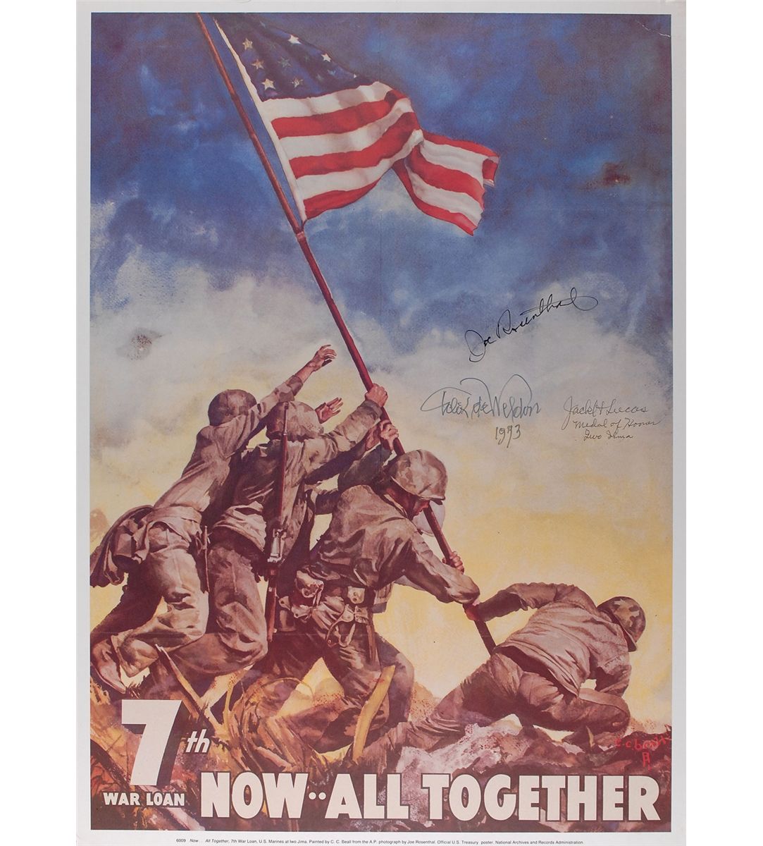 Color 20 x 28 poster entitled ‘Now…All Together,’ depicting the Iwo Jima flag-raising, signed in felt tip by Medal of Honor recipient Jack Lucas, Joe Rosenthal, and Iwo Jima memorial sculptor Felix de Weldon. Poster is affixed to a slightly larger off-white mount. In fine condition, with light intersecting folds, a repaired tear to top left corner, and adhesive remnants to mount.