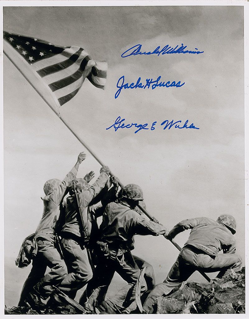 Glossy 11 x 14 photo of the Iwo Jima flag raising, signed in blue felt tip by three Medal of Honor recipients from that battle: Jack Lucas, Hershel Williams, and George Wahlen. In very fine condition.