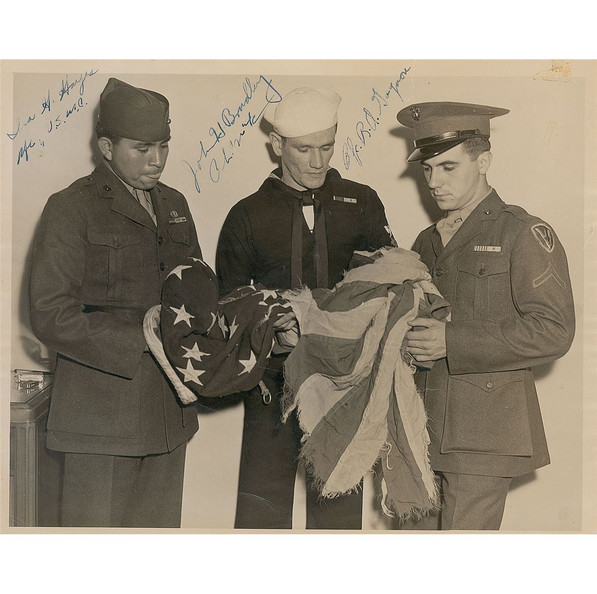 Rare vintage 10 x 8 photo of three of the men captured in the historic photograph of the American flag being raised at Iwo Jima, shown examining the tattered flag, signed in fountain pen by all three: “Ira H. Hayes, Pfc., U.S.M.C.,” “John H. Bradley, Ph. M. 2/c,” and “Pfc. R. A. Gagnon.” Notation on reverse in an unknown hand reads: “The three survivors of the flag raising on Iwo Jima with the original flag. Boston, Mass. May 14, 1945.” In very good to fine condition, with scattered creasing and rippling, adhesive remnant to top right corner, a bit of light silvering, and some irregular ink adhesion to Gagnon’s signature. Bradley, Gagnon, and Hayes were three of the six US soldiers who planted the American flag atop Mount Suribachi on the Japanese island of Iwo Jima—an event captured on film by photographer Joe Rosenthal, which became one of the most familiar images of World War II. With three of the enlisted men killed in action within a month of the flag-raising, President Franklin D. Roosevelt transferred the survivors to Washington, DC, and ordered them to participate in the Seventh War bond drive. Following orders, the trio toured the nation with the tattered American flag they helped raise; the photo offered here was obtained during that fund-raising campaign. A phenomenal image of three unlikely heroes who, along with their fallen comrades, became the collective ‘face’ of World War II.
