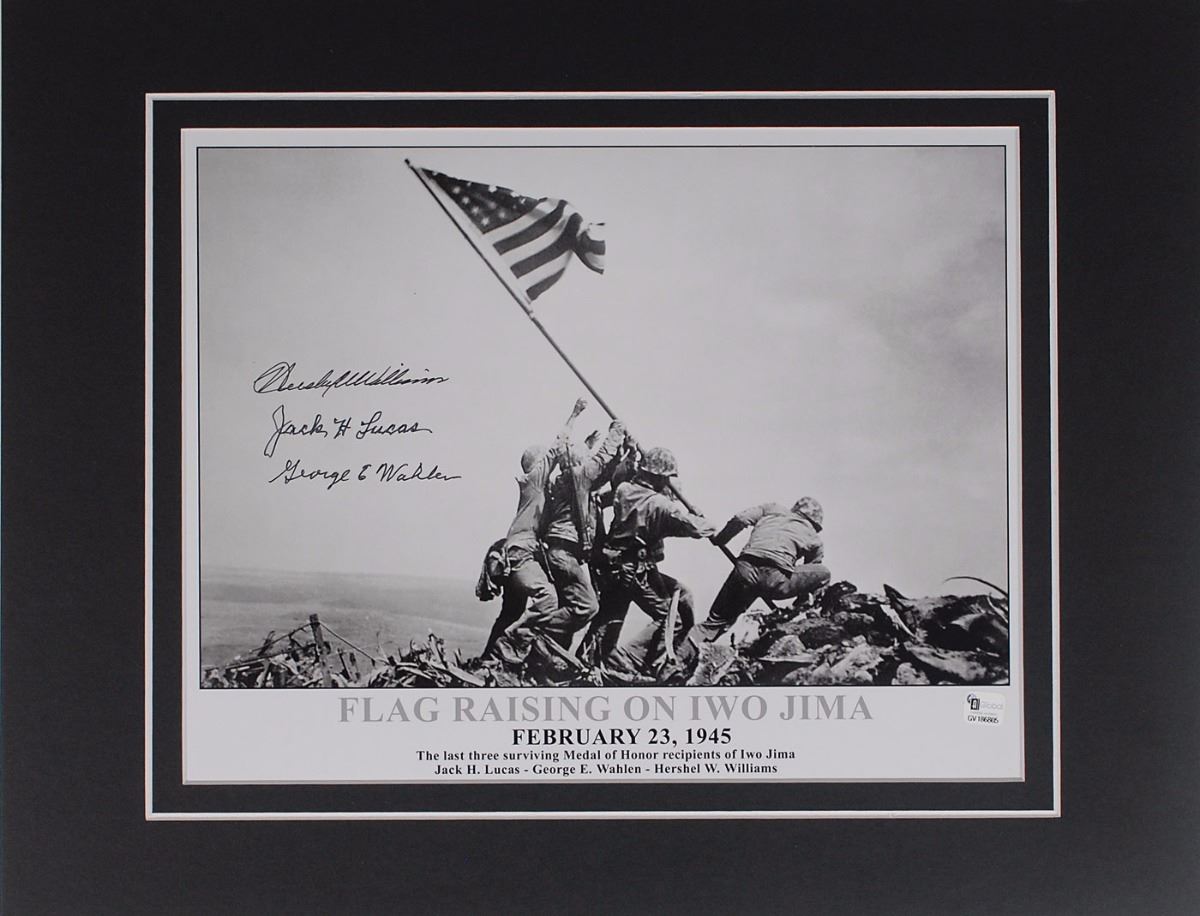 Patriotic semi-glossy 12.25 x 9.75 photo of the Iwo Jima flag raising on Mt. Suribachi, signed in black ink by three Medal of Honor recipients from that battle: Hershel W. Williams, Jack H. Lucas, and George E. Wahlen. Matted to an overall size of 18 x 14. In fine condition, with a Global authentication label affixed to lower right.