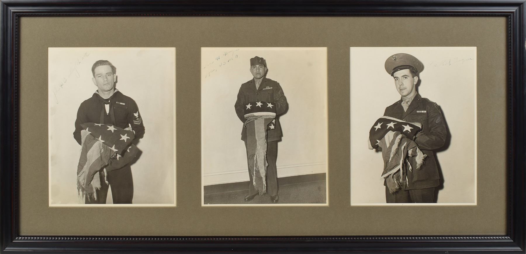 Impressive display of three vintage matte-finish 7.75 x 9.75 three-quarter-length photos of the surviving Iwo Jima flag-raisers, each individually signed in fountain pen by the soldier pictured, "John H. Bradley, Ph. M 2/c," "Ira H. Hayes, Pfc., U.S.M.C.,” and “Pfc. R. A. Gagnon.” Archivally matted and framed to an overall size of 15.75 x 32.25. In fine condition, with the signatures somewhat faded but all legible. Bradley, Gagnon, and Hayes were three of the six US soldiers who planted a US flag atop Mount Suribachi on the Japanese island of Iwo Jima—an event captured on film by photographer Joe Rosenthal, which became one of the most familiar images of World War II. With three of the enlisted men killed in action within a month of the flag-raising, President Franklin D. Roosevelt transferred the survivors to Washington, D. C. and ordered them to participate in the 7th War Bond Drive. Following orders, the trio toured the nation with the tattered American flag they helped raise. A phenomenal union of three unlikely heroes who, along with their fallen comrades, became the collective ‘face’ of World War II.
