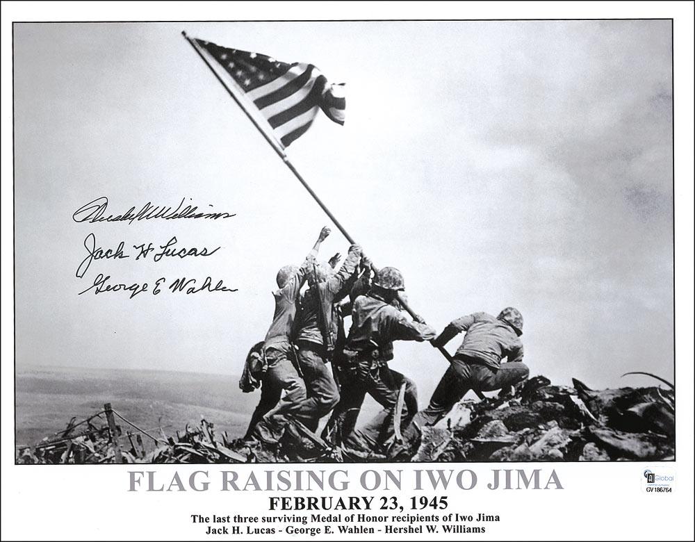 Satin-finish 12.75 x 10 historic photograph of the American flag being raised at Iwo Jima, signed in black felt tip by the three surviving Medal of Honor recipients: Hershell Williams, Jack Lucas, and George E. Wahlen. In fine condition, with a few small creases to left border. RRAuction COA.