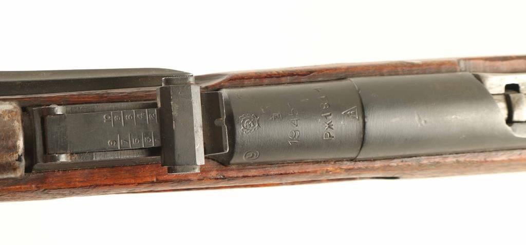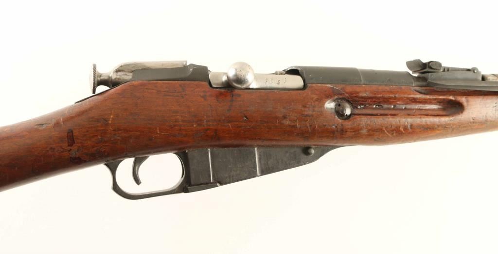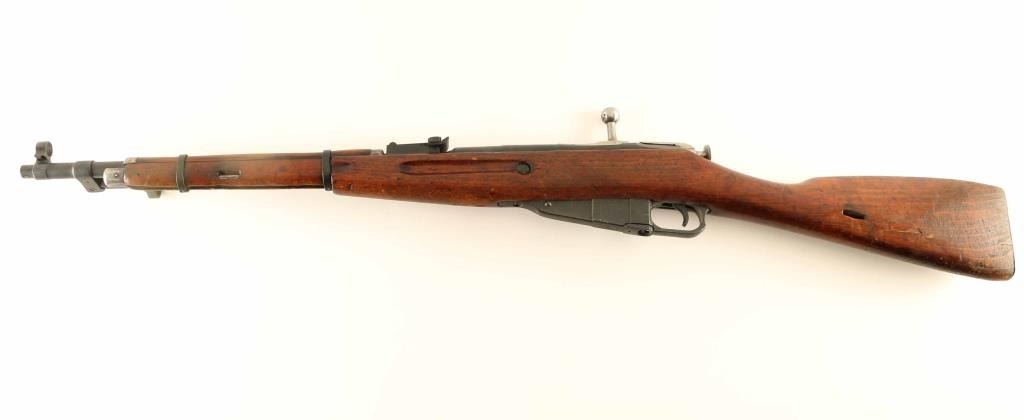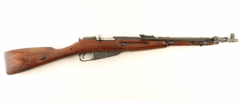 Russian military rifle dated 1945, chambered for the 7.62x54 Rimmed cartridge, imported by CAI of St Albans VT. Features a folding bayonet, 'post in circle' style front sight, tangent style rear sight, straight bolt, approx. 20 inch barrel. Bore is in good condition, dark with strong rifling. Bluing is very good overall. Caps on ends of handguard and muzzle end of stock are mostly bare metal. Bolt is in the white. Wood stock is in good serviceable condition with loss of most varnish and some roughening at several area. Observed numbers match; floorplate is a "forced match" with new old number struck through. Condition is NRA Good ***C&R Firearm***