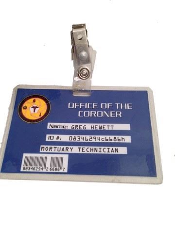 Izombie (2015-present)-From the Zombie feeding frenzy long running TV Series is a production acquired screen used rubber knife and a "Office of the Coroner" mortuary technician ID.(13x3)