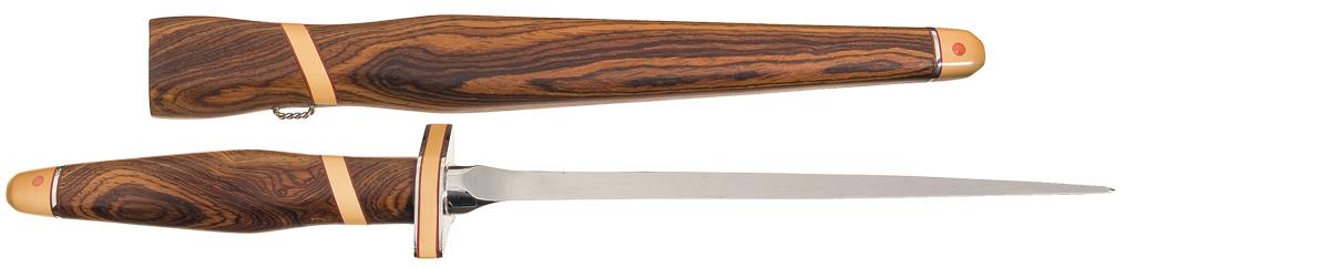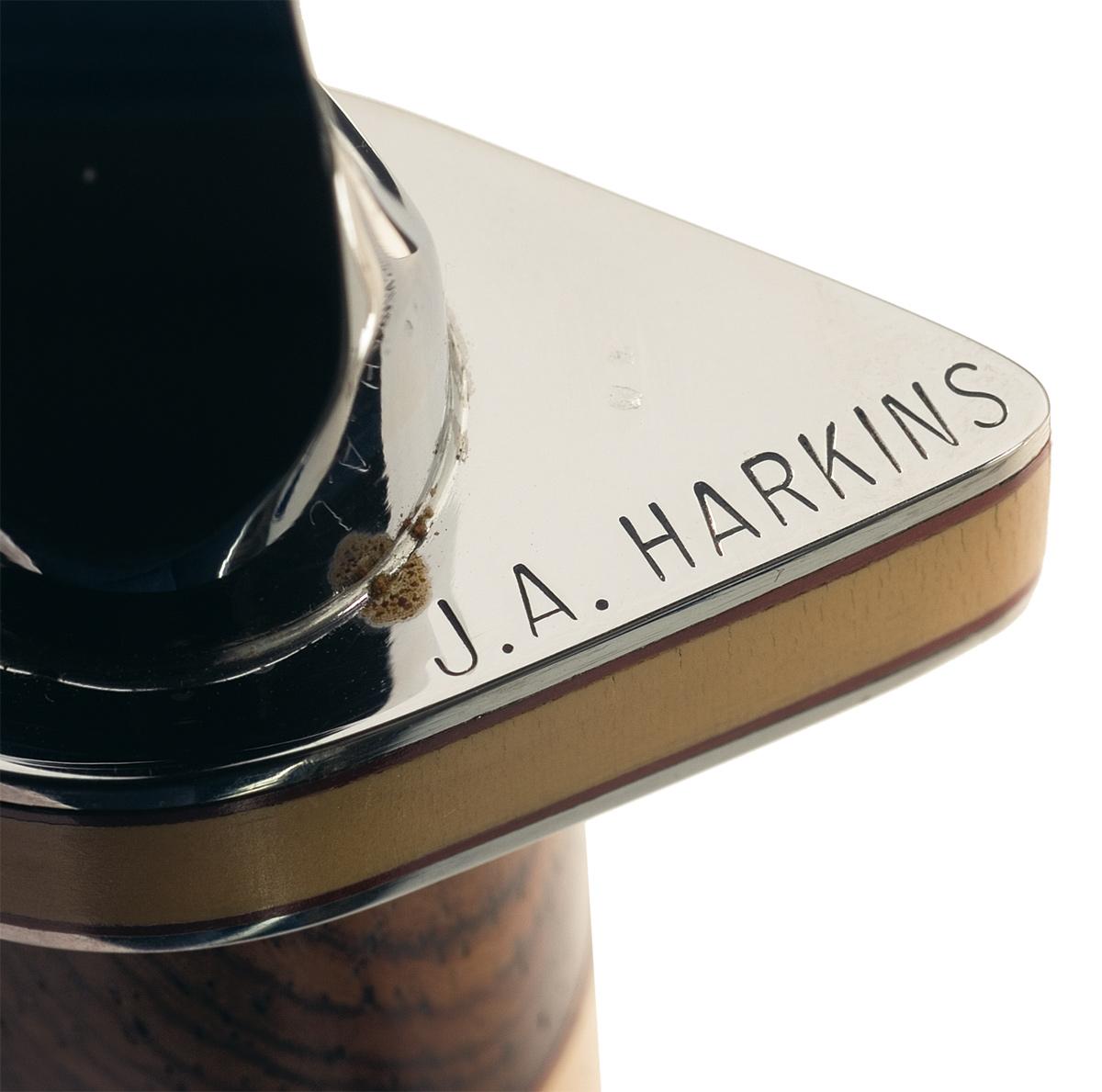 This dagger was fabricated by J.A. Harkins who has been handcrafting knives for over 20 years and specializes in automatics. The dagger has an 8 7/8 inch spike blade. The diamond shaped guard is marked "J.A. HARKINS" and has a composite insert. Fancy grain hardwood handle with composite insert and tip. All of the composite accents are outlined in red. OAL: 14 3/4". The included sheath mimics the dagger handle.