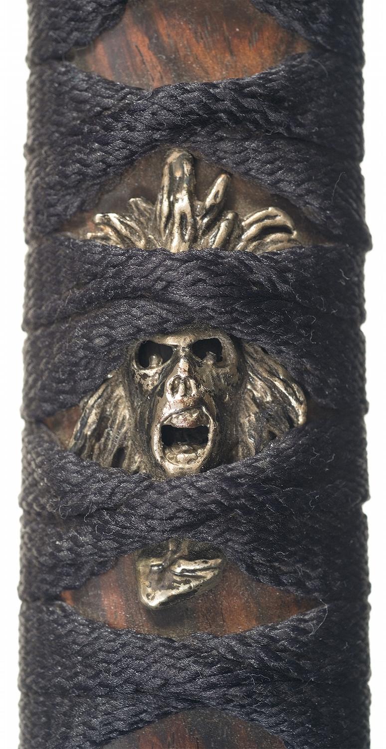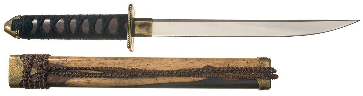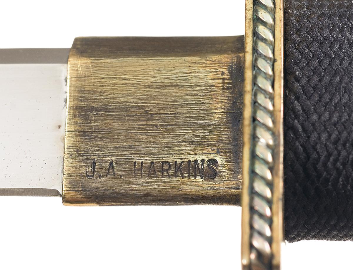 This Japanese inspired knife was fabricated by J.A. Harkins who has been handcrafting knives for over 20 years and specializes in automatics. The knife has an 11 inch blade with a brass collar marked "J.A. HARKINS". The brass pommel and rectangular guard have silver rope work. Nicely figured rosewood handle with a fierce three dimensional silver warrior's head attached to the left side. OAL: 19 1/4". Complete with a nicely figured rosewood sheath adorned with two brass bands having a hammered appearance.
