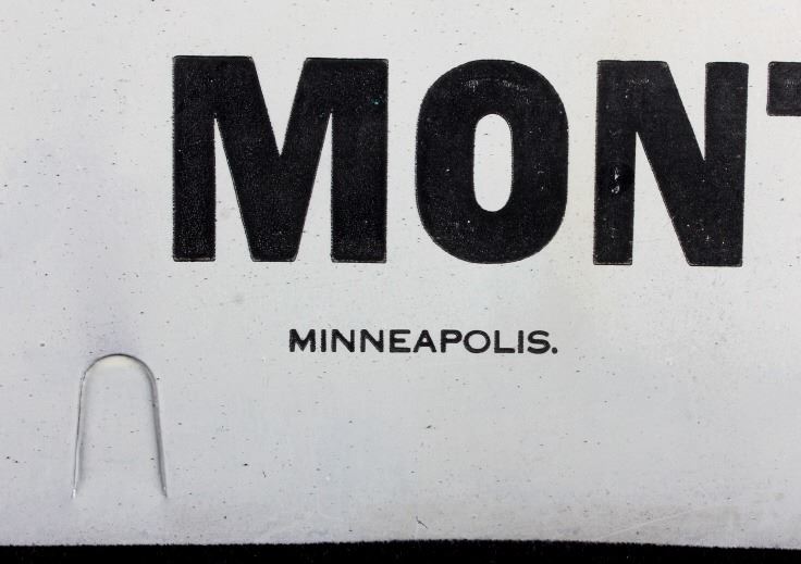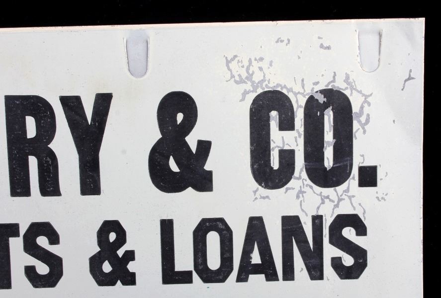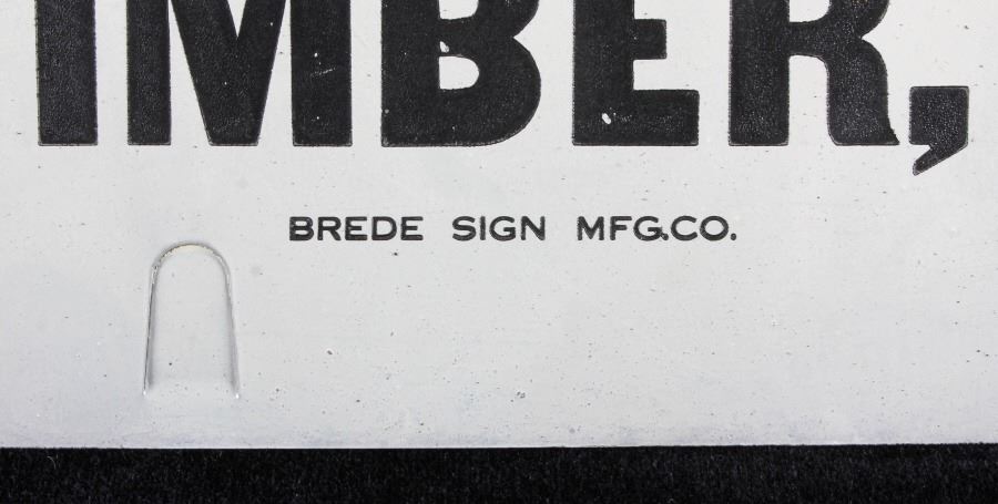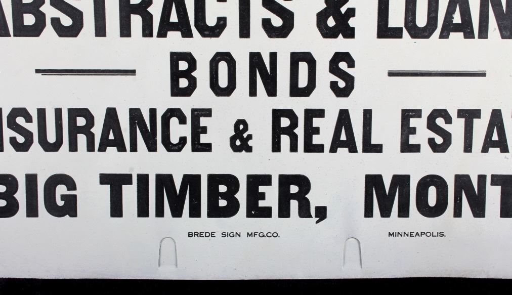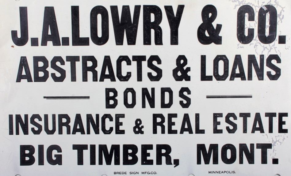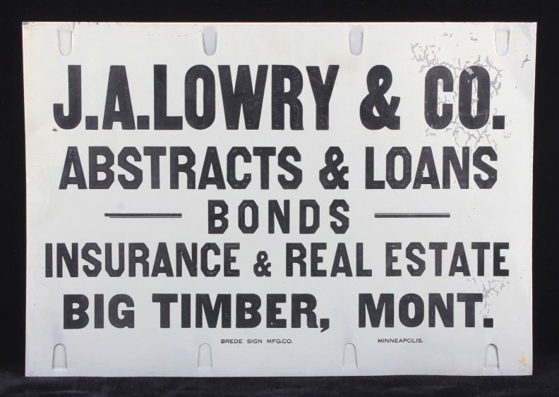 This is an original advertising sign from Big Timber, Montana. The sign reads "J.A. Lowry & Co. Abstract & Loans Bonds Insurance & Real Estate Big Timber, Mont." The sign is also marked "Brede Sign Mfg. Co. Minneapolis". The Big Timber sign is in good condition. It measures 14" x 20".