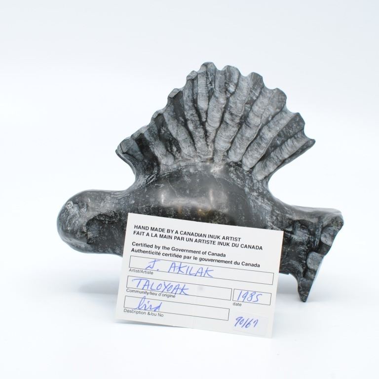 J. Akilak's "Bird" original Inuit carving. Carved in 1985, from the community of Taloyoak. Carved from stone, and certified by the government of Canada. This carving is in excellent condition. Included with its certification tag.