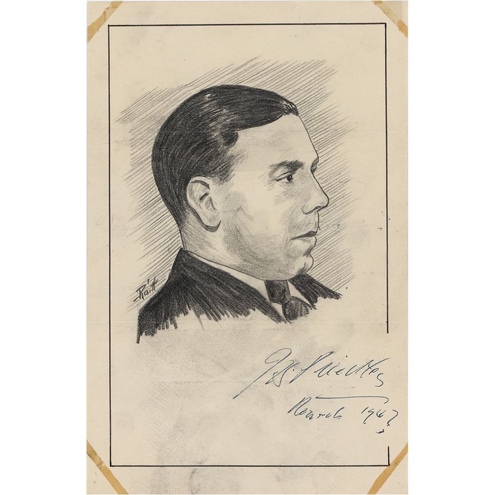 English writer, social commentator, and broadcaster (1894-1984) who is remembered for the novel The Good Companions, and whose left-wing beliefs influenced the rise of the Welfare State. Original sketch of English writer J. B. Priestley by artist John Raitt, accomplished in graphite on an off-white 5.5 x 8.5 sheet, signed in the lower right in ink, "J. B. Priestly, March 1947." The sketch is also signed by the artist. In fine condition, with thin tape stains at the corners. John Raitt began sketching celebrities while a college student in the 1930s. He sent pencil portraits like this to his famous subjects, requesting that they be autographed and returned.