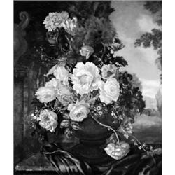 Blumenstilleben. Oel auf Leinwand. - <U>Signiert</U>. Größe: 81 x 70 cm. Mit leichten Krakelüren und Farbabsplitterungen sowie schwach gegilbt. Gerahmt.