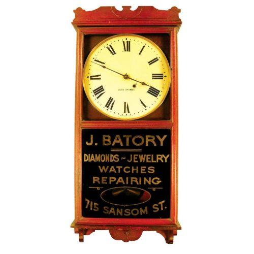 J. Batory jewelers clock in wood case. Worked when we photographed it. Excellent original condition. 14 1/4 X 35 1/2 inches.