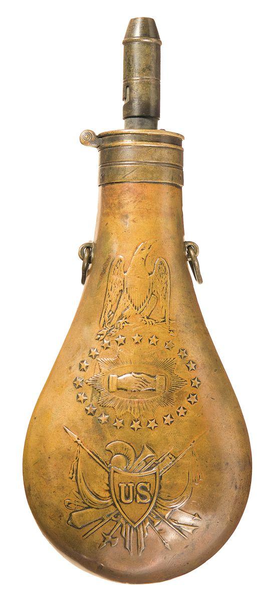 8" tall, with the top marked "1847 / S.K." and "BATTY". Three-position spout, spring loaded lever and triangular carrying rings. Design present on both sides. Very good, with a fine aged patina and a few mild dents. The embossing shows some wear, but overall remains clear.