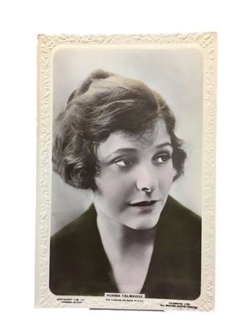 A unique and extremely rare postcard collection (~9) ca. 1920 produced by J. Beagles & Co. Ltd and Lily White Ltd. These uniquely colored postcards feature portraits of early film stars: George Arthur, Elinor Fair (2), Pauline Ferderick, Constance Talmadge (2), Norma Talmadge and Fannie Ward. On the front side of each postcard is an embossed white floral border. Also included in this collection is a never-before-seen hand crafted colored image of Ian Keith with Corinne Griffith from the award winning film "The Divine Lady". To the left of their image is the poem "Lady Divine, I knew thee, Long ere we met, it seems, You were beside me truly, Living in all of my dreams". Verso on some of the postcards are pencil markings, copyright information and company stamps and the language “Printed in Britain” or “England” and credit is given to “Lilywhite Photographic Series”. These rare postcards are in very good condition and give us a glimpse into the British and Hollywood Silent Film Industry. Some images include photographic reproduction of the original autograph (approx. 3.5 x 5 in).