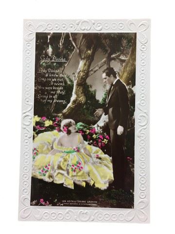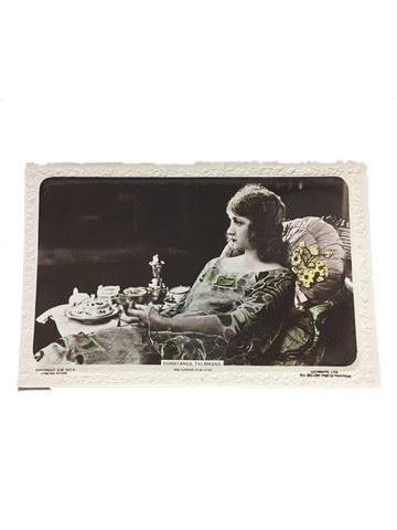 A unique and extremely rare postcard collection (~9) ca. 1920 produced by J. Beagles & Co. Ltd and Lily White Ltd. These uniquely colored postcards feature portraits of early film stars: George Arthur, Elinor Fair (2), Pauline Ferderick, Constance Talmadge (2), Norma Talmadge and Fannie Ward. On the front side of each postcard is an embossed white floral border. Also included in this collection is a never-before-seen hand crafted colored image of Ian Keith with Corinne Griffith from the award winning film "The Divine Lady". To the left of their image is the poem "Lady Divine, I knew thee, Long ere we met, it seems, You were beside me truly, Living in all of my dreams". Verso on some of the postcards are pencil markings, copyright information and company stamps and the language “Printed in Britain” or “England” and credit is given to “Lilywhite Photographic Series”. These rare postcards are in very good condition and give us a glimpse into the British and Hollywood Silent Film Industry. Some images include photographic reproduction of the original autograph (approx. 3.5 x 5 in).