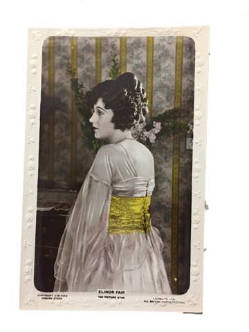 A unique and extremely rare postcard collection (~9) ca. 1920 produced by J. Beagles & Co. Ltd and Lily White Ltd.  These uniquely colored postcards feature portraits of early film stars: George Arthur, Elinor Fair (2), Pauline Ferderick, Constance Talmadge (2), Norma Talmadge and Fannie Ward. On the front side of each postcard is an embossed white floral border. Also included in this collection is a never-before-seen hand crafted colored image of Ian Keith with Corinne Griffith from the award winning film "The Divine Lady".  To the left of their image is the poem "Lady Divine, I knew thee, Long ere we met, it seems, You were beside me truly, Living in all of my dreams". Verso on some of the postcards are pencil markings, copyright information and company stamps and the language “Printed in Britain” or “England” and credit is given to “Lilywhite Photographic Series”. These rare postcards are in very good condition and give us a glimpse into the British and Hollywood Silent Film Industry. Some images include photographic reproduction of the original autograph  (approx. 3.5 x 5 in).