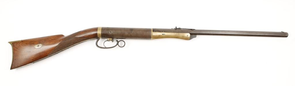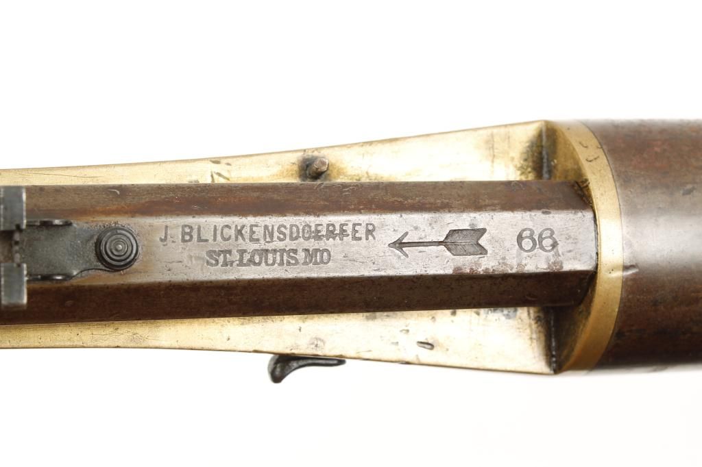 J. Blickensdoerfer St. Louis, Missouri marked early American airgun showing barrel marked at breech with arrow and number 66. The gun measures 44” overall with 22” medium weight octagon barrel of approximately .31 caliber.The barrel tilts up and unlocks on the latch in a forward portion of the brass forend and there is a large cocking lever which extends to the front of the trigger guard which ends in a ring. The airgun is not cocking and therear sight is a replacement. The metal surfaces are in good condition with some light minor pitting and good markings. Est.: $400-$800