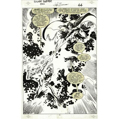<B>John Buscema and Vince Mielcarek - Silver Surfer: Judgment Day, page 46 Original Art (Marvel, 1988).</B></I> The Prince of Evil, Mephisto, makes another attempt to get his hands on the Silver Surfer's soul, in this page from <B>Silver Surfer: Judgment Day</B></I>, a graphic novel written by Stan Lee and illustrated by John Buscema. The image area measures 10" x 15" and the condition is Very Good. Signed by John Buscema along the top edge. <BR><BR><B>Important notice:</B> Heritage usually auctions material at the rate of 200-250 lots per hour. On some occasions eBay Live bid software or the Internet may not be able to keep up with the pace of the auction. We recommend placing a realistic absentee bid now as insurance to avoid disappointment. Occasionally the auctioneer may eliminate or reject an eBay Live bid, and the auctioneer may also reopen a lot after the close of the eBay live bidding (usually because we missed an audience bid), and may reject your bid even if it shows you as the winning bidder. By bidding via eBay Live, you agree that Heritage may award the lot to another bidder at its sole discretion under the circumstances described above or any other reasonable circumstances. Since eBay bids are not shown to us until we open the lot on the floor, we treat those bids just like floor bids. In most cases the floor responds before the eBay bid is presented to us, due to Internet lag time, so for consistency we have made it a policy that floor bids are always considered first over tie eBay live bids. Also please note that all Heritage lots purchased through eBay Live carry a 22.5% Buyer's Premium. Please make sure you read the Terms and Conditions before you bid. This lot is being auctioned in conjunction with a live floor auction by Heritage Auction Galleries. All final auction and invoice information will be supplied by Heritage Auction Galleries, and all other information should be considered preliminary. Lot:41001 <BR><BR><B>Winning Notification and Billing:</B> After the FINAL session in this auction is complete, Heritage will send e-mail and snail mail invoices. This process normally takes several days. All final auction and invoice information will be supplied by Heritage Auction Galleries, and all other information should be considered preliminary. <BR><BR>This auction will be conducted on a live auction floor and over the Internet through eBay Live. If you choose to place an absentee bid, please take a moment to <font color='#0000ff'><u><a href='http://pages.ebay.com/liveauctions/help/before/laabsentee.html'>learn how eBay Live absentee bidding works</a></u></font><font color='#000000'>