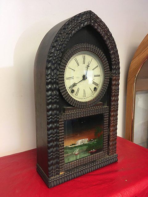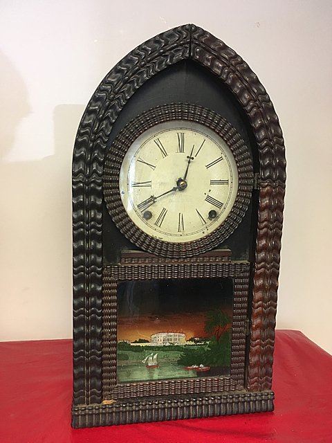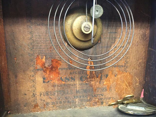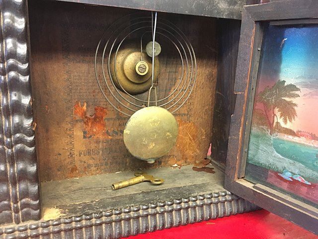 Rare antique J.C. Brown Beehive Ripple Front Clock. Beautiful 8 day brass works clock with fully rippled case, reverse painted glass tablet, label reads "Eight Day Brass Clock, Forestville Manufacturing J.C. Brown, Bristol, Connecticut. Key wind, pendulum. Measures approx. 18 1/2" tall x 10 1/2" wide x 4" deep.
