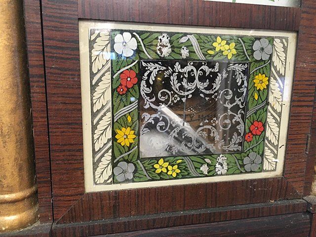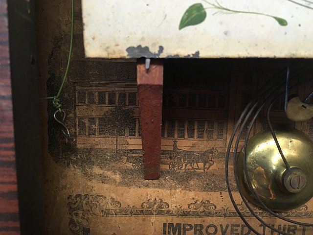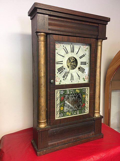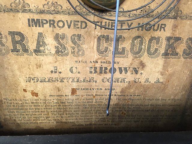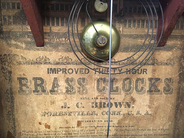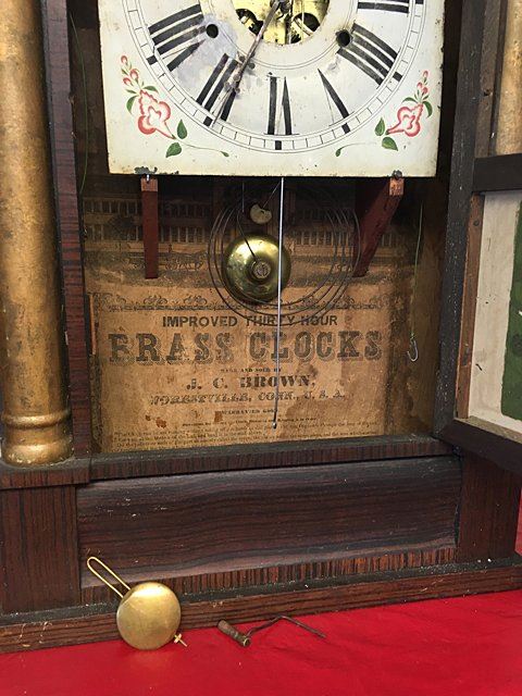Antique J.C. Brown, Forestville, CT 8 Day Empire shelf clock. 30 hour, early brass movement, hand painted dial, reverse painted bottom tablet, gold gilt painted half columns. Beautiful label, "Improved Thirty Hour Brass Clocks, Made and Sold by J. C. Brown, Forestville, Conn. U.S.A.", key wind with pendulum. Nice, rare antique clock measures approx. 24 1/2" tall x 15" wide x 4" deep.