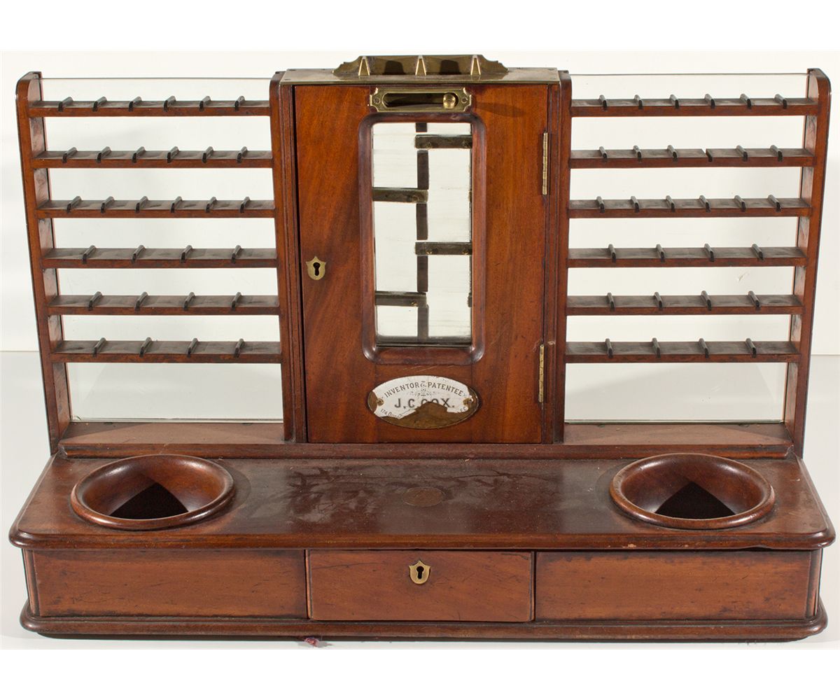 c1900 This handsome wood, brass, and glass countertop coin till was invented, patented, and manufactured by J. C. Cox--an inventor of several devices to change gold coins, to store coins in tills, and to track “payments made over a public house bar, counter, or elsewhere" [REF: ftldesign.com/cox]. This particular machine is a coin till, 25" wide, 16" tall, and 8" deep. Two glass-fronted racks to the left and right held counted coins, while the central mechanism carries coins through a transaction, allowing both the customer and the clerk to see which coins were used as payment, and which are due in correct change. At each "stop" the coin sounds a bell housed in the lower portion of the central mechanism. A label in the compartment indicates "Notice: To ensure the easy and perfect working of these Tills, they must be kept thoroughly clean and free from all corroded beer &c. And the least touch of oil on the brass bearing for sliding sash only." The interior of the front door on the till is inscribed "Patent 5052". The original key for the front door and drawer is included. The remnants of a broken white enamel tag on the front of the till (from the Clerk`s point of view) indicate "Inventor & Patentee/ J. C. Cox/ 174". The countertop bears two deep wooden bowls, possibly used to hold basic change for transactions. This till is a beautiful, fascinating, and interactive piece of early saloon and mercantile history. - HKA#64939