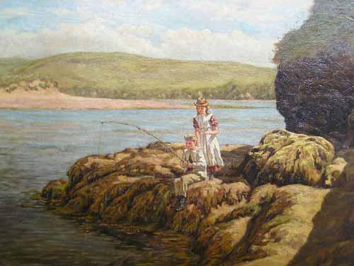 J C H - children fishing on a rocky coast - oil on canvas, initialled and dated 1877, 50cms x 75cms £250-350