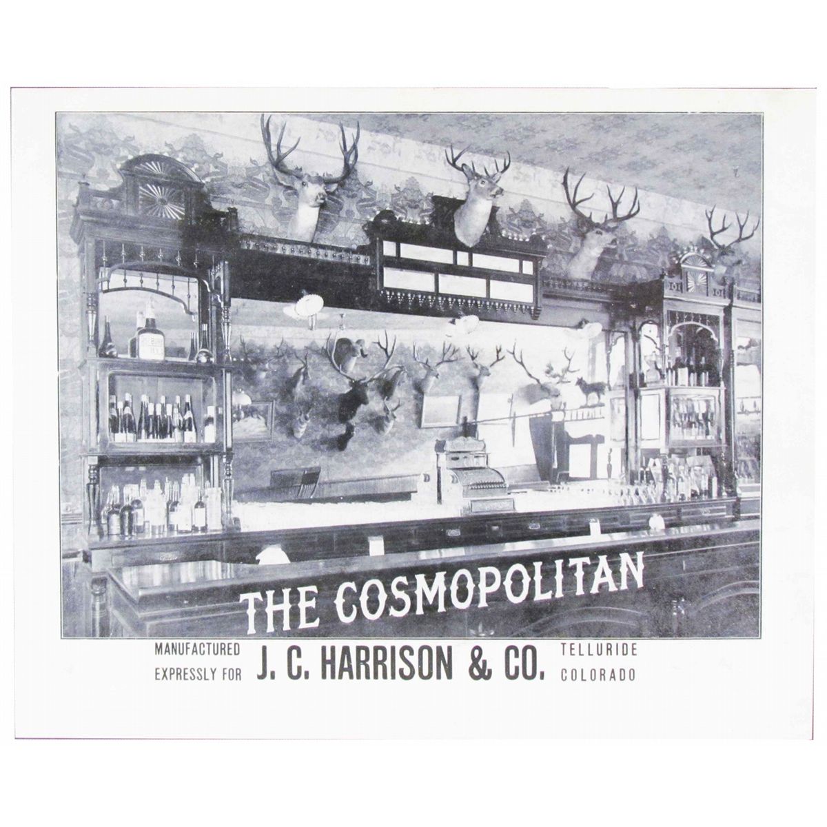 J.C. Harrison & Co. "The Cosmopolitan" Cigar Label Set, Telluride, CO. Rare black and white image of early saloon. Excellent condition. Inside label measures 9 1/4 X 7 1/2 inches.
