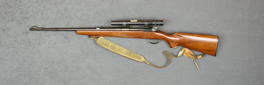 J.C. Higgins Model 50 bolt-action rifle,  .30-06 cal., 22” barrel, blue finish, wood  stock with leather padded sling, #24514. This  gun is in overall very good to fine  condition showing the majority of originalblue with very good bore, crisp action and  very good wood with the usual scattered nicks  and mars from carry and storage; mounted  with a Higgins 4X scope with clear optics.   Est.:  $200-$400.