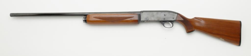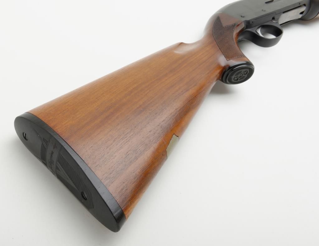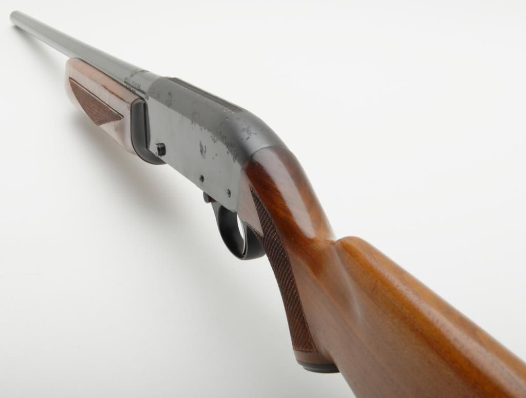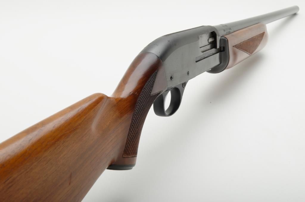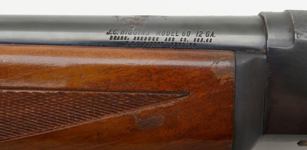 J.C. Higgins Model 60, semi-automatic shotgun with 2 ¾ “chamber, cal. 12 gauge, NSNV. The shotgun retains a considerable amount of blue on both the action and 28” barrel. There is moderate pitting on the action and barrel, with some surface rust near the barrel address. The shotgun has checkered wood stocks which show small mars consistent with use. A brass colored escutcheon plate was added to the buttstock. The shotgun is missing its action arm. Est.: $100-$200 (Modern/PPT)
