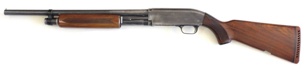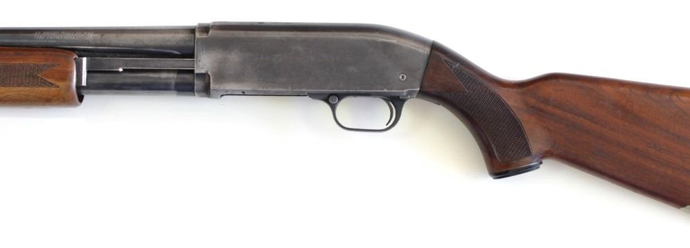 J.C. Higgins model 20 16ga. NVSN pump action shotgun with shortened 20" barrel, blued finish and checkered walnut stocks. Action and bore both very good. From an old St. Louis collection. Est. 125-200pump action shotgun with shortened 20" barrel, blued finish and checkered walnut stocks. Action and bore both very good. From an old St. Louis collection. Est. 125-200