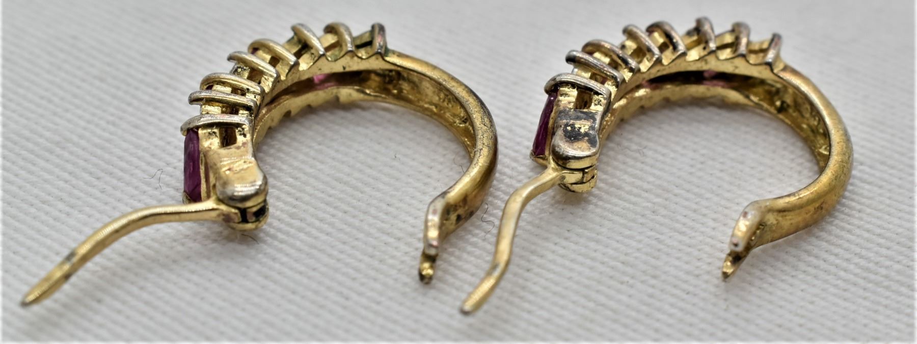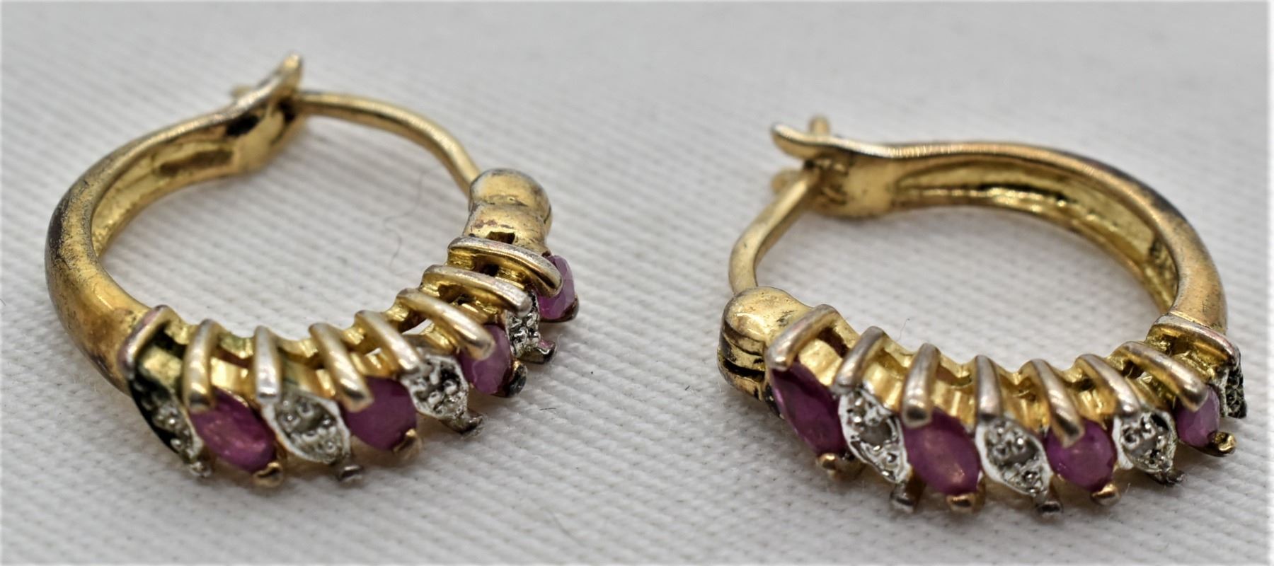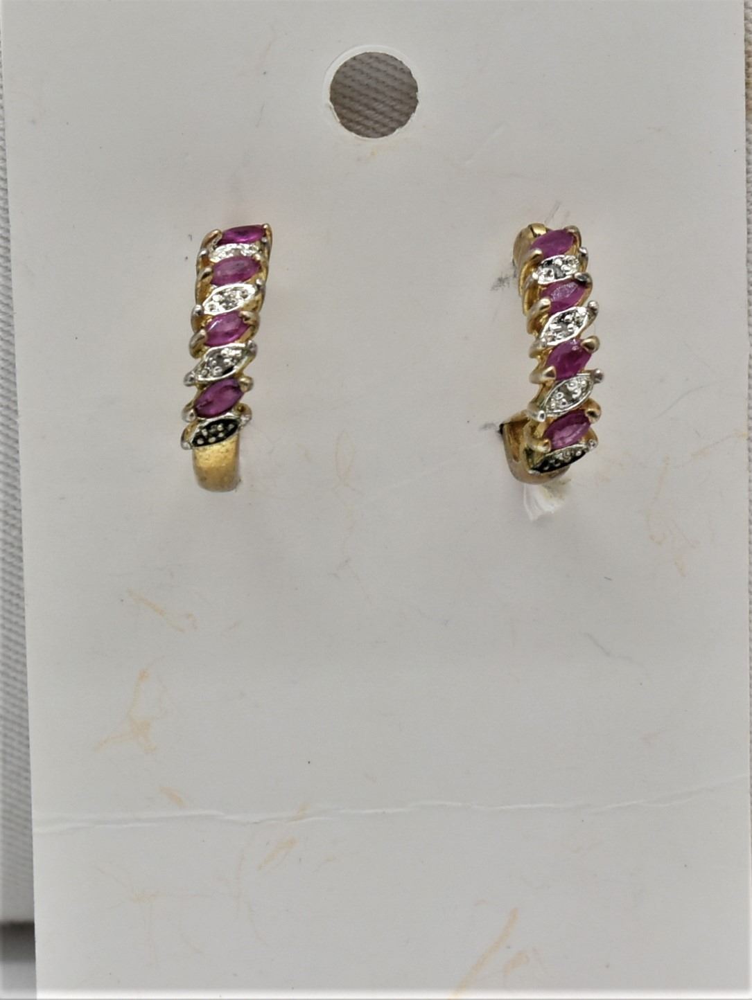 J C Jewels Ruby and Diamond Chip Half Hoop Earrings, hallmarked JC, unsure if these are gold or gold tone as they have not been tested, measure 1''L x .25''W