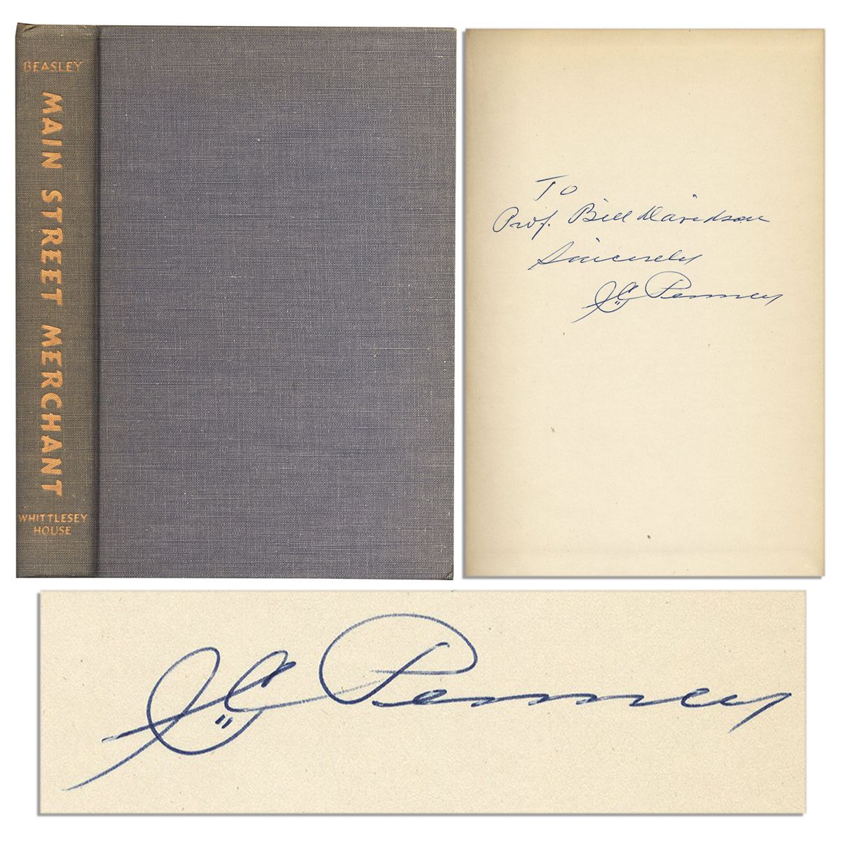 Retail mogul J.C. Penney signed copy of ''Main Street Merchant, The Story of the J.C. Penney Company'', written by Norman Beasley and published by Whittlesey House, McGraw-Hill Book Company, Inc.: New York & Toronto: 1948. Inscribed in blue ink, ''To Prof. Bill Davidson / Sincerely, J.C. Penney''. Bound in grey cloth boards. Sunning to backstrip and light uniform toning. Very good condition.