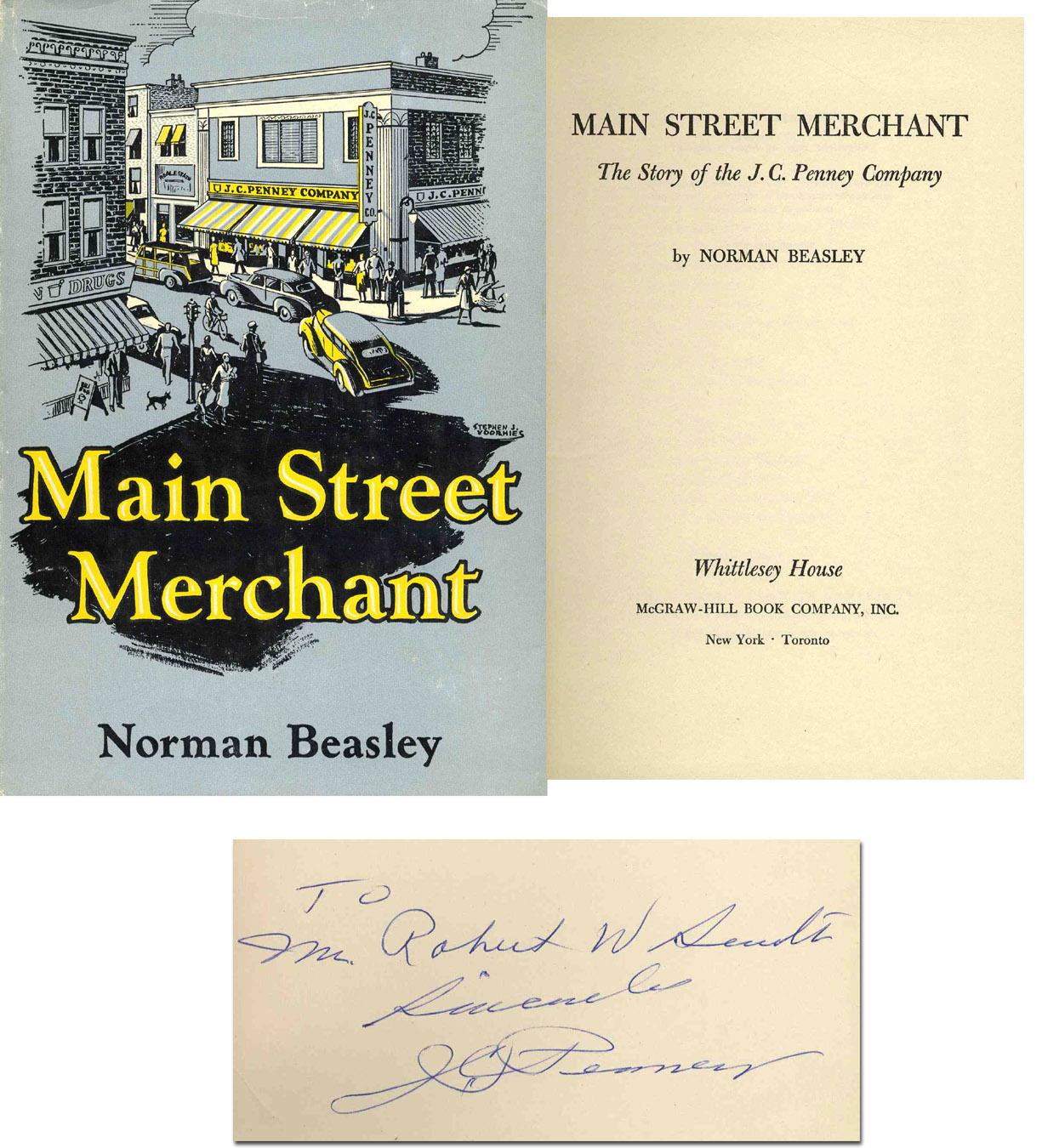 ''Main Street Merchant: The Story of the J.C. Penney Company'' by Norman Beasley. New York: McGraw-Hill Book Company: 1948. Signed in blue ink to front free endpaper: ''To Mr. Robert W. Sendt / Sincerely / J.C. Penney.'' Hardcover octavo with dustjacket runs 278pp. Dustjacket contains chips and tears along top and bottom margins. Book remains clean and bright. Overall excellent condition.