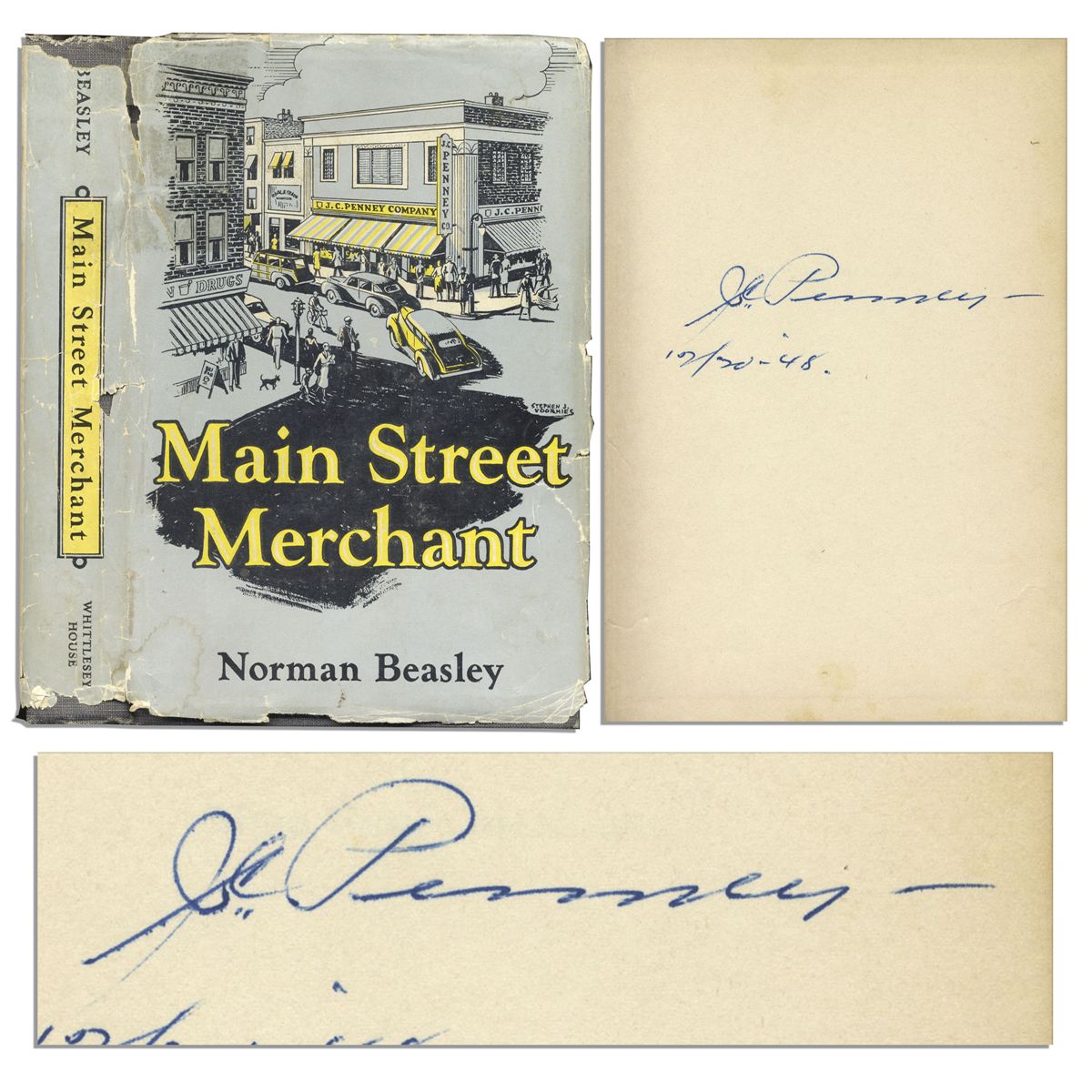 First edition of ''Main Street Merchant - The J.C. Penney Story'', signed by J.C. Penney in 1948. The story of the entrepreneurial rise of Penney was written by Norman Beasley and published by Whittlesey House, McGraw-Hill Book Company, Inc.: New York & Toronto: 1948. Signed upon the front free endpaper, '' J.C. Penney / 10/20 - 48.'' Book is bound in grey cloth boards. Light uniform toning, otherwise near fine. Housed in an unclipped dustjacket, showing the very first J.C. Penney store. Dustjacket is in fair condition.