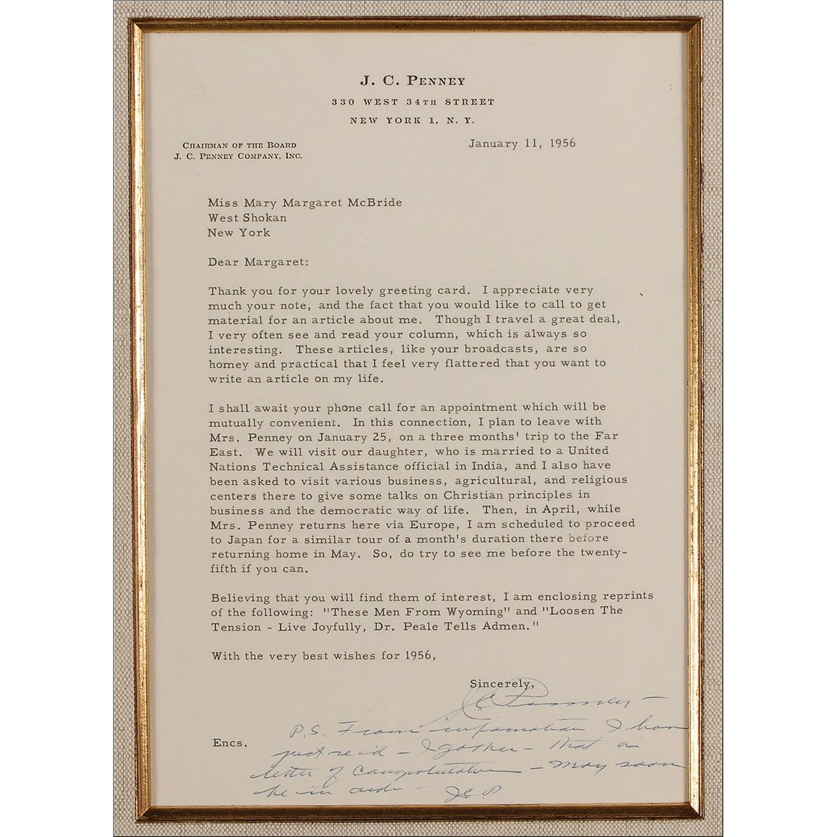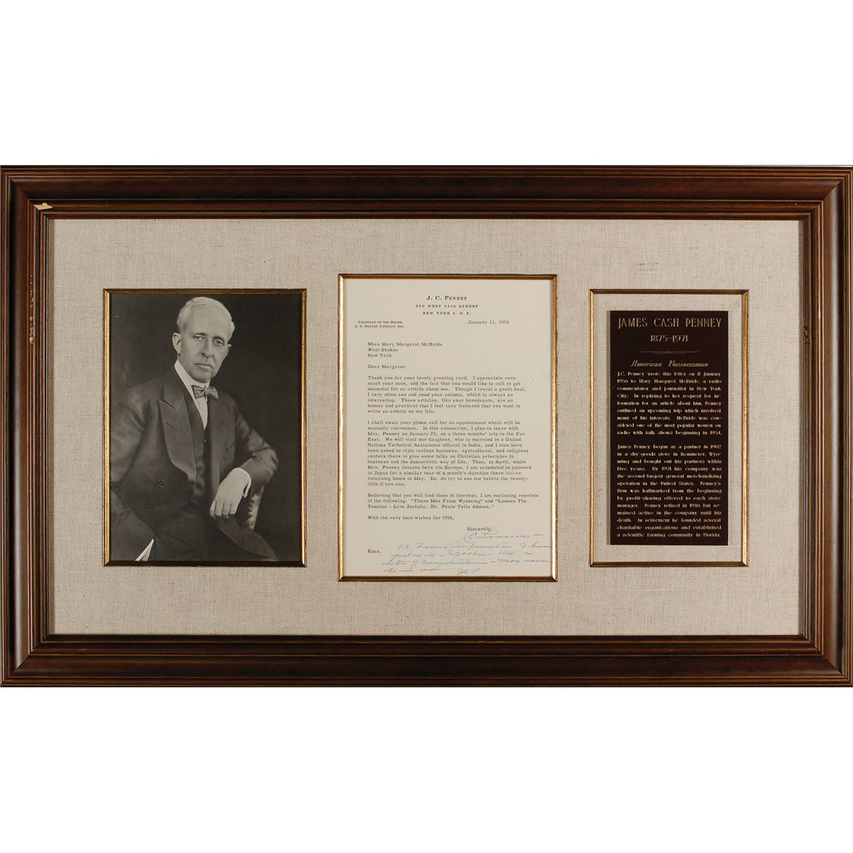 American businessman and entrepreneur (1875–1971) who built a chain of eponymous retail stores and pioneered employee profit sharing. TLS, one page, 7 x 10, personal letterhead, January 11, 1956. Penney writes to Mary Margaret McBride of New York, in part: “I appreciate very much your note, and the fact that you would like to call to get material for an article about me. Though I travel a great deal, I very often see and read your column, which is always so interesting. These articles, like your broadcasts, are so homey and practical that I feel very flattered that you want to write an article on my life…I plan to leave with Mrs. Penney on January 25, on a three months’ trip to the Far East…I also have been asked to visit various business, agricultural, and religious centers there to give some talks on Christian principles in business and the democratic way of life…So, do try to see me before the twenty-fifth if you can. Believing that you will find them of interest, I am enclosing reprints of the following: ‘These Men From Wyoming’ and ‘Loosen the Tension—Live Joyfully, Dr. Peale Tells Admen,” adding a post-script in blue ballpoint, “From information I have just rec’d—I gather—that a letter of congratulations—may soon be in order, J. C. P.” Cloth-matted and framed, with a photo of Penney and a descriptive plaque which references the recipient of the letter, Mary Margaret McBride, who “was considered one of the most popular women on radio with talk shows beginning in 1934,” to an overall size of 29.5 x 18. In fine condition. Accompanied by the original mailing envelope. Oversized.