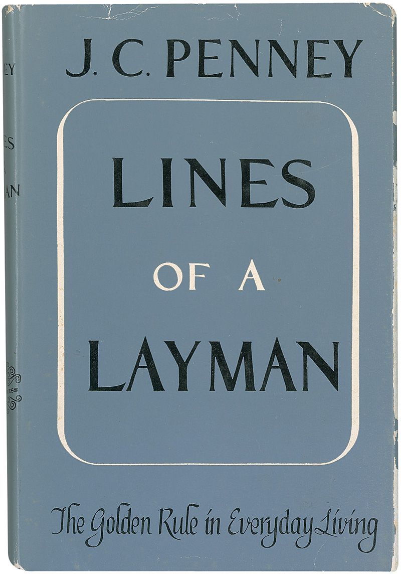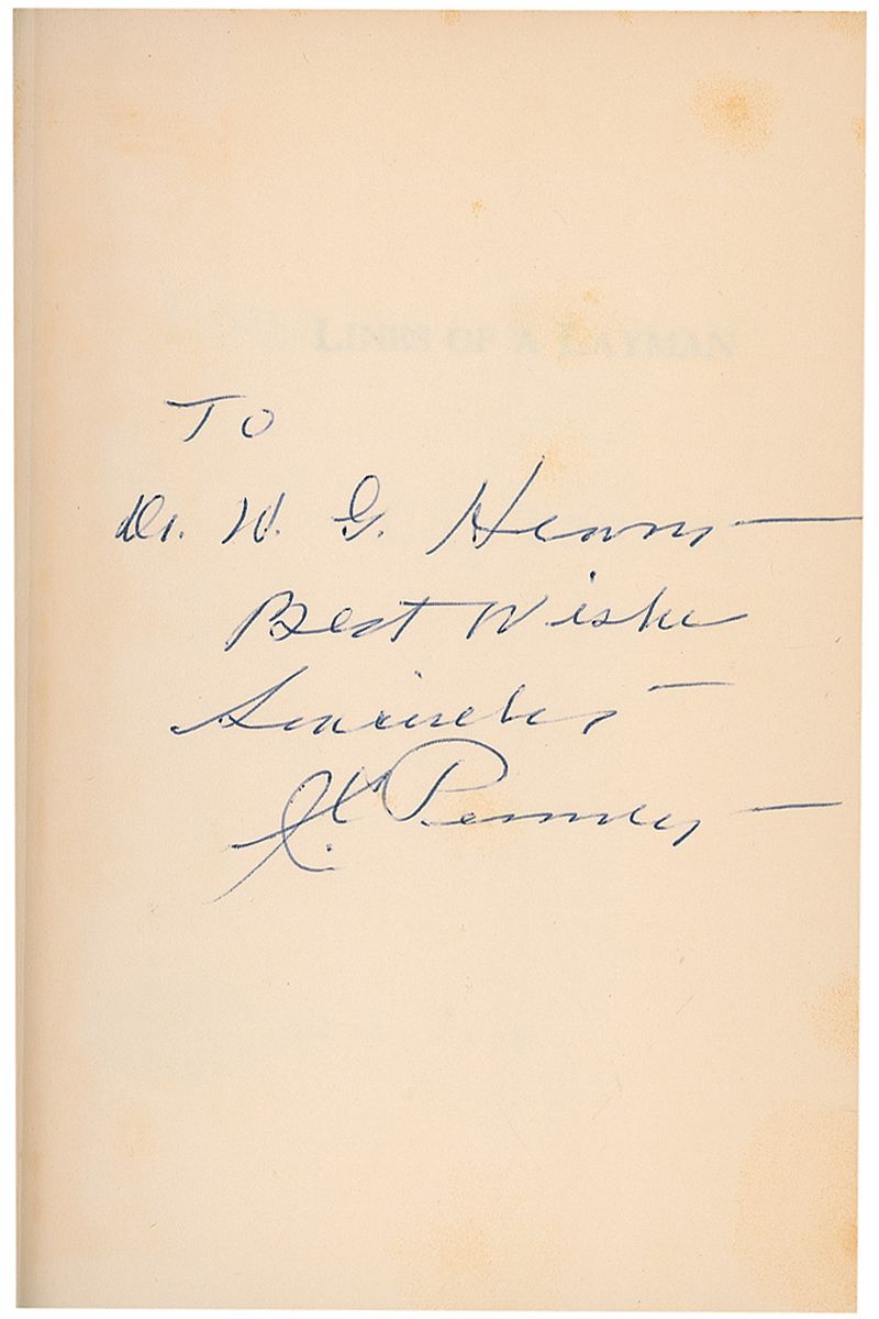 Signed book: Lines of a Layman. Later printing. NY: Channel Press, 1956. Hardcover with dustjacket, 5.5 x 8.25, 224 pages. Signed and inscribed on the first free end page, “To Dr. W. G. Henm—Best wishes, Sincerely—J. C. Penney.” Scattered light toning to signed page and both pastedowns, spotting to both boards, and scattered wear and small tears to dustjacket, otherwise fine condition.