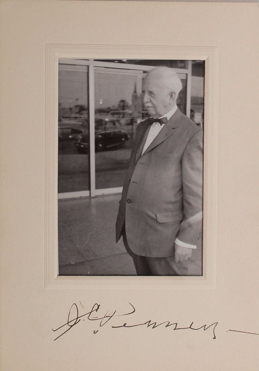 Nice glossy 3 x 4.5 photo of Penney posing for a photo in front of one of his stores in Mesa, Arizona, matted to an overall size of 5.25 x 7.75, signed on the mat in black ink. Reverse bears an affixed newspaper clipping indicating the store where the photo was taken, as well as an affixed ownership caption, dating the signature to February 25, 1967. In fine condition, with irregular ink adhesion to a single letter of the signature, and trivial silvering and surface impressions to photo.
