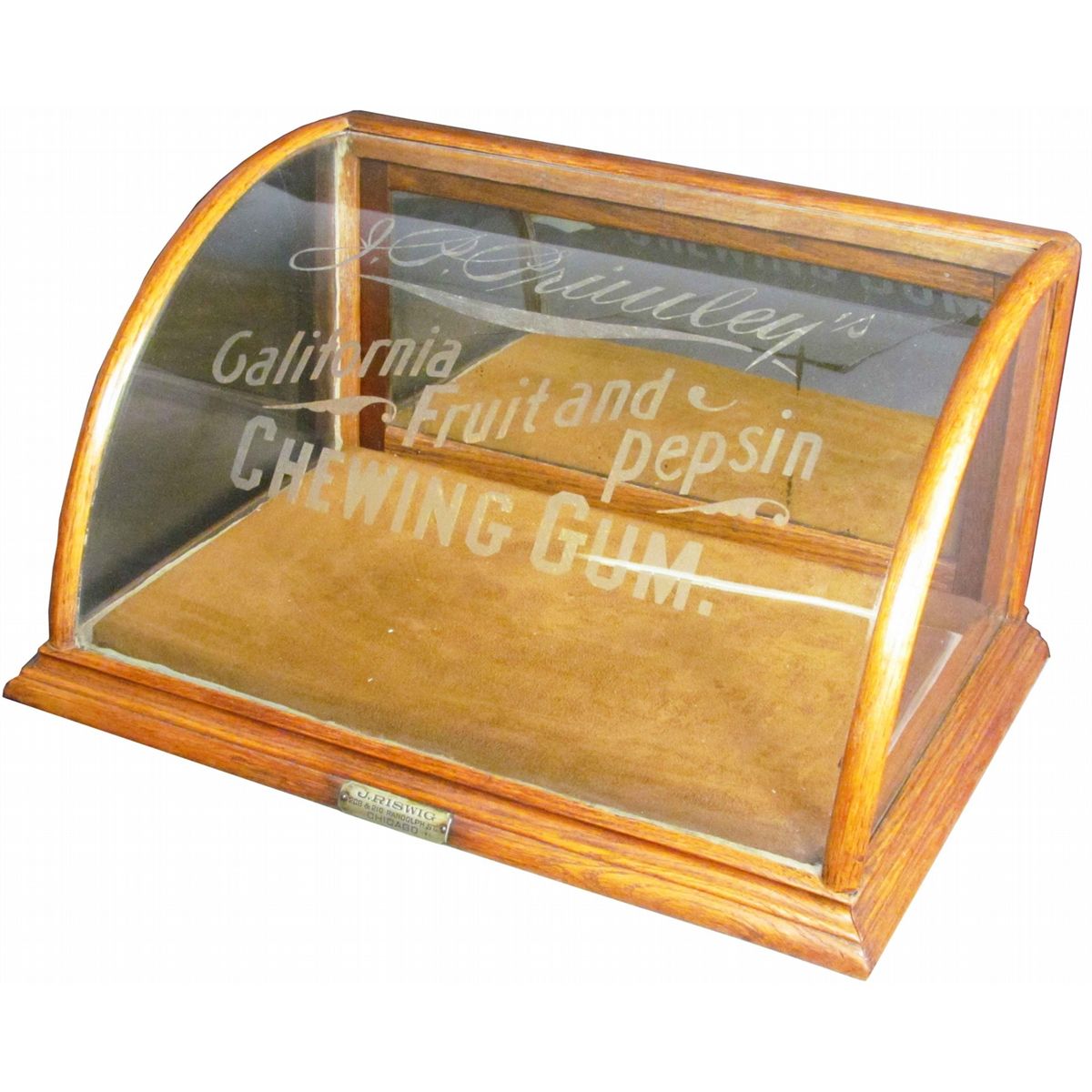 J.C. Primley's California Fruit and Pepsin Gum Case. Etched curved glass front. J. Riswig Showcase Maker, Chicago. Excellent condition. 18 1/2 X 9 1/2 X 12 inches.