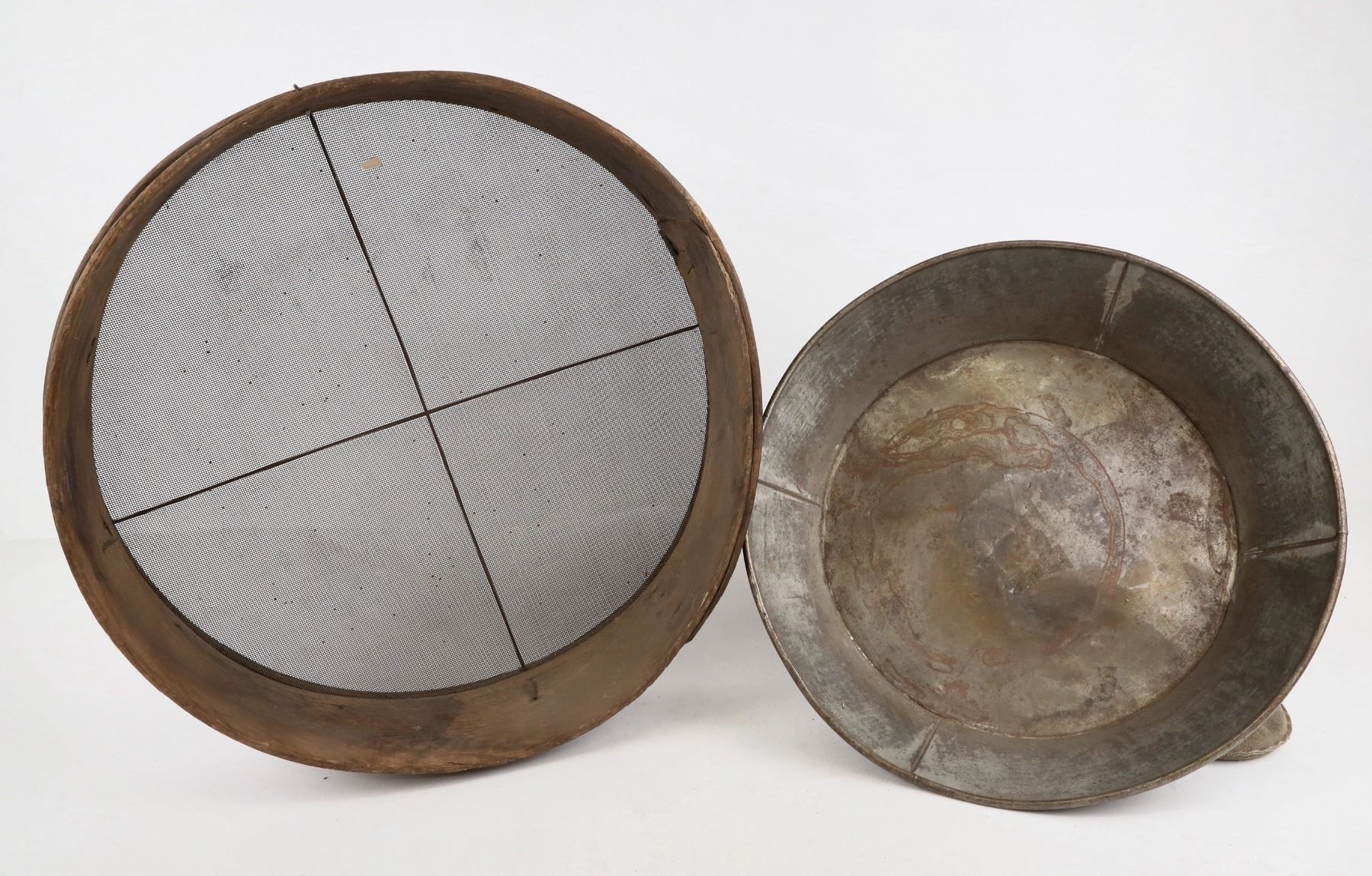 Large, 17" diameter sifting screen marked from J. Caire Assay Supplies, SF. and old milk pan often used as a gold pan. 14.5" diameter. c 1910.